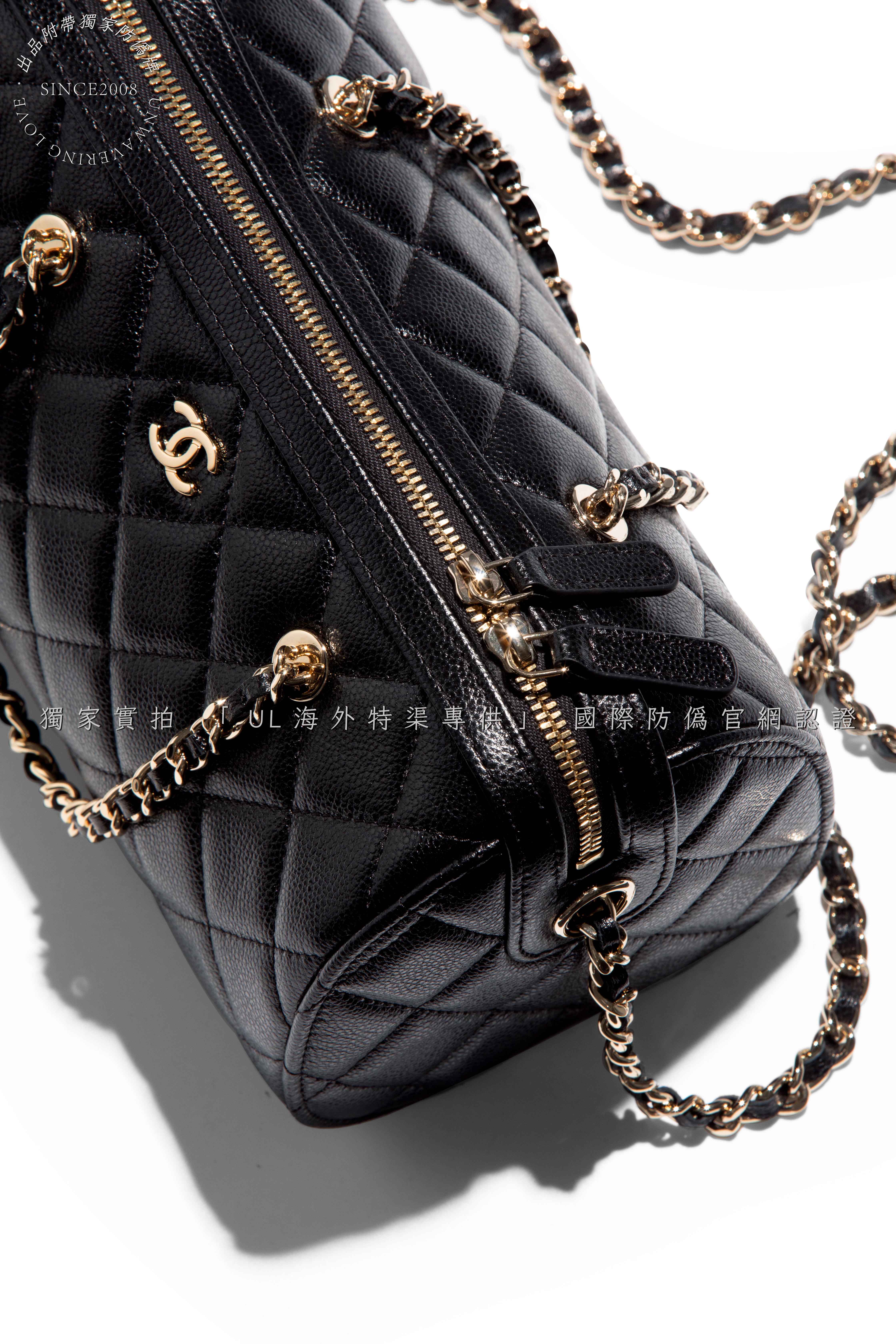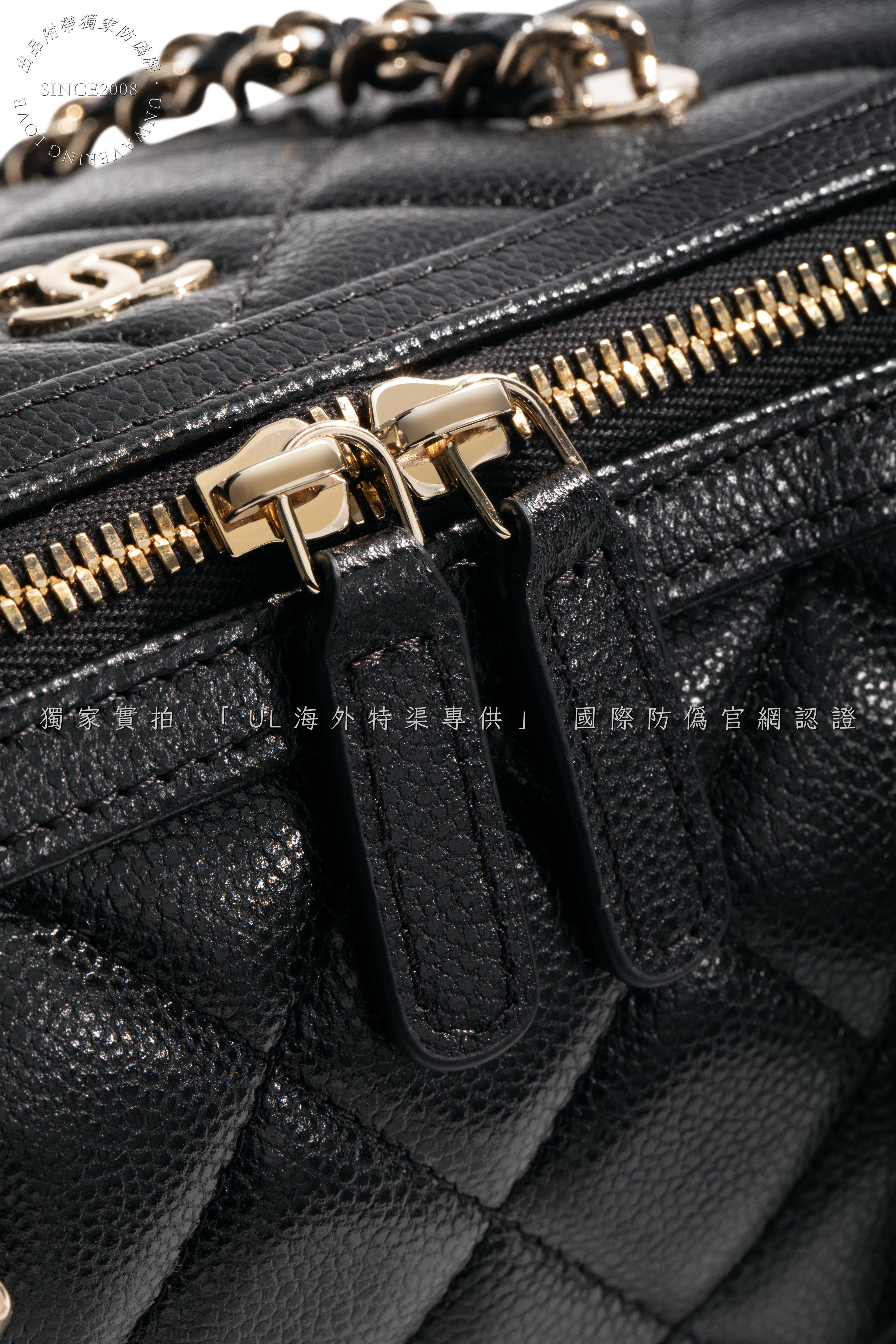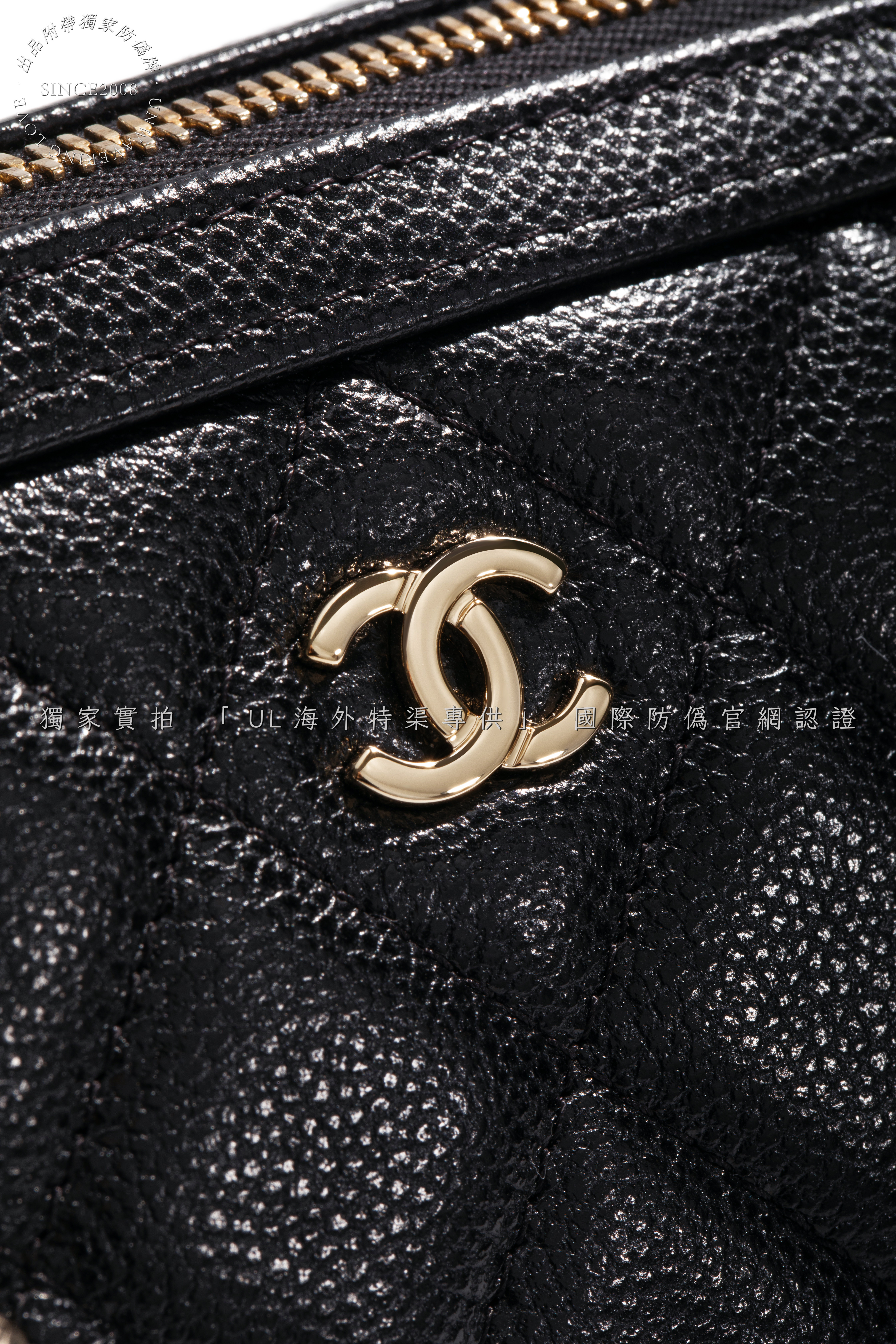 Secure double-zip closure with engraved "CHANEL" pull tabs.