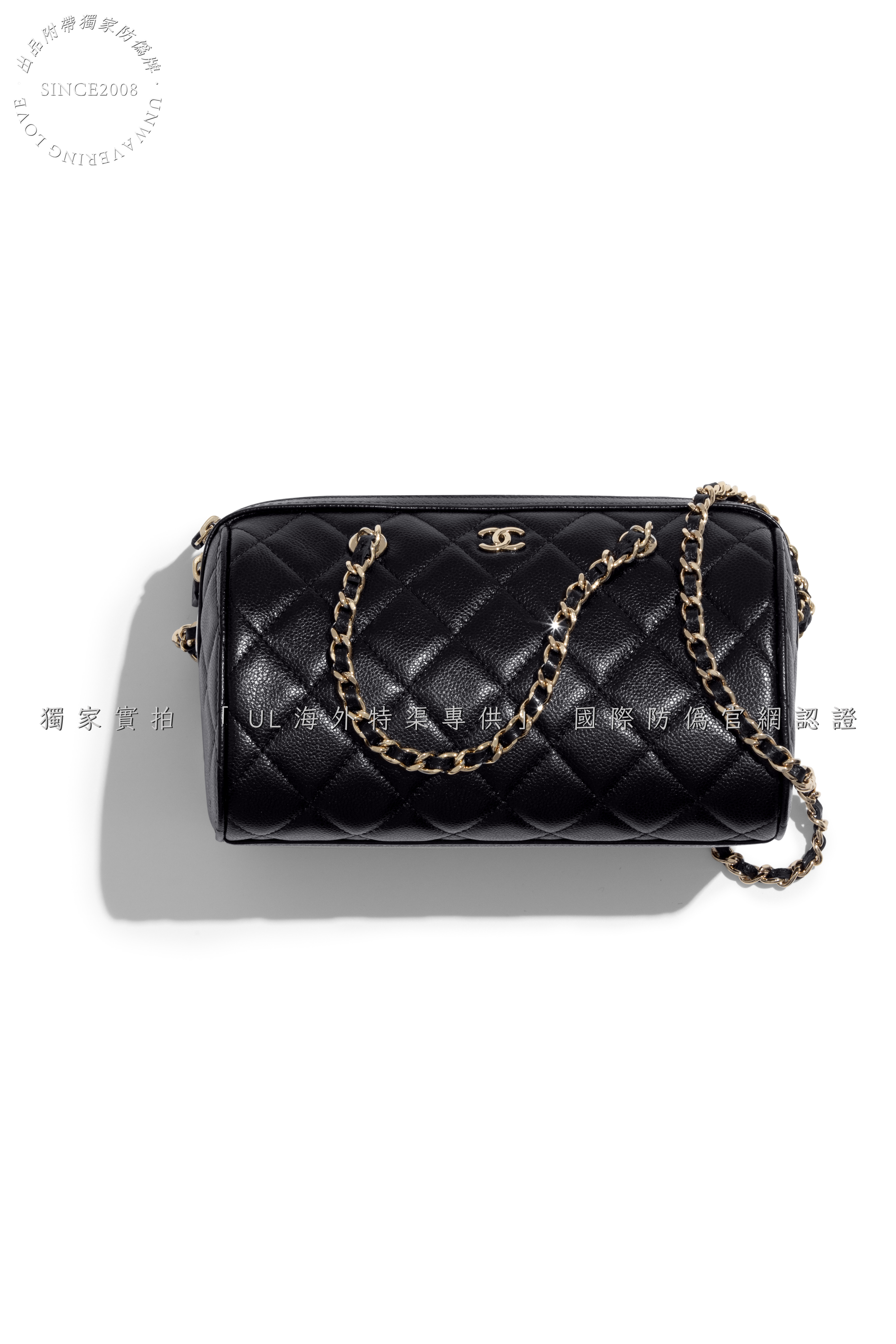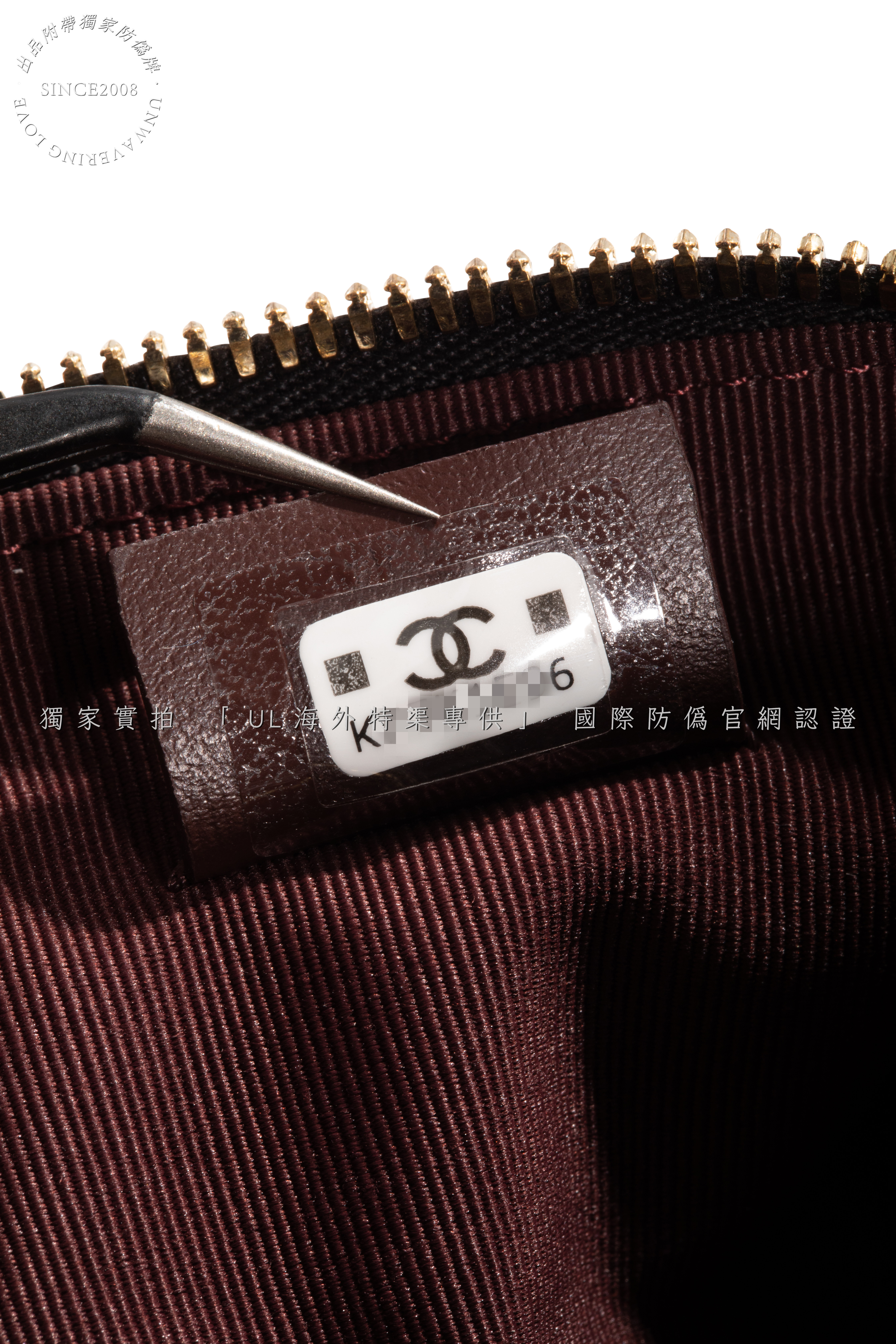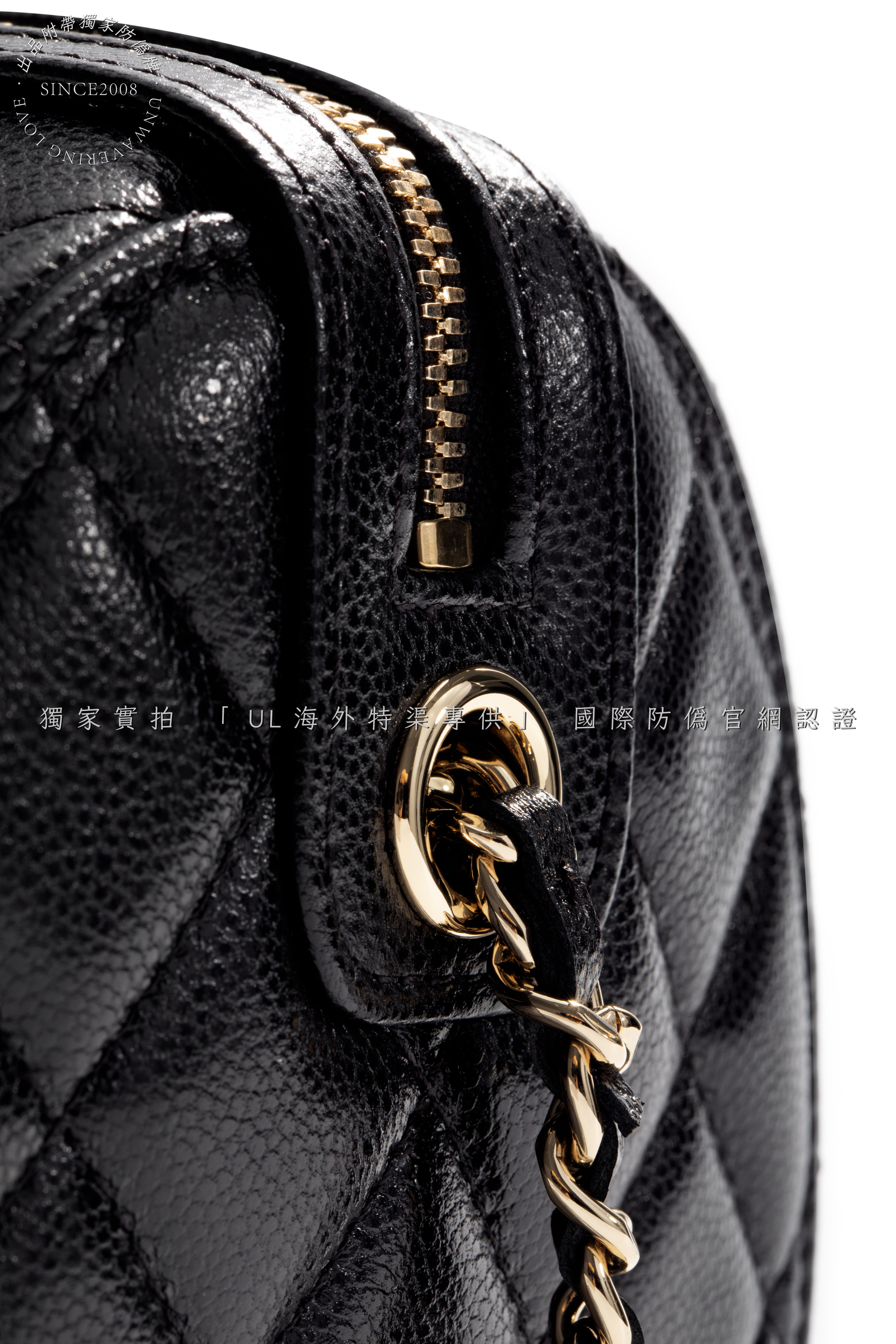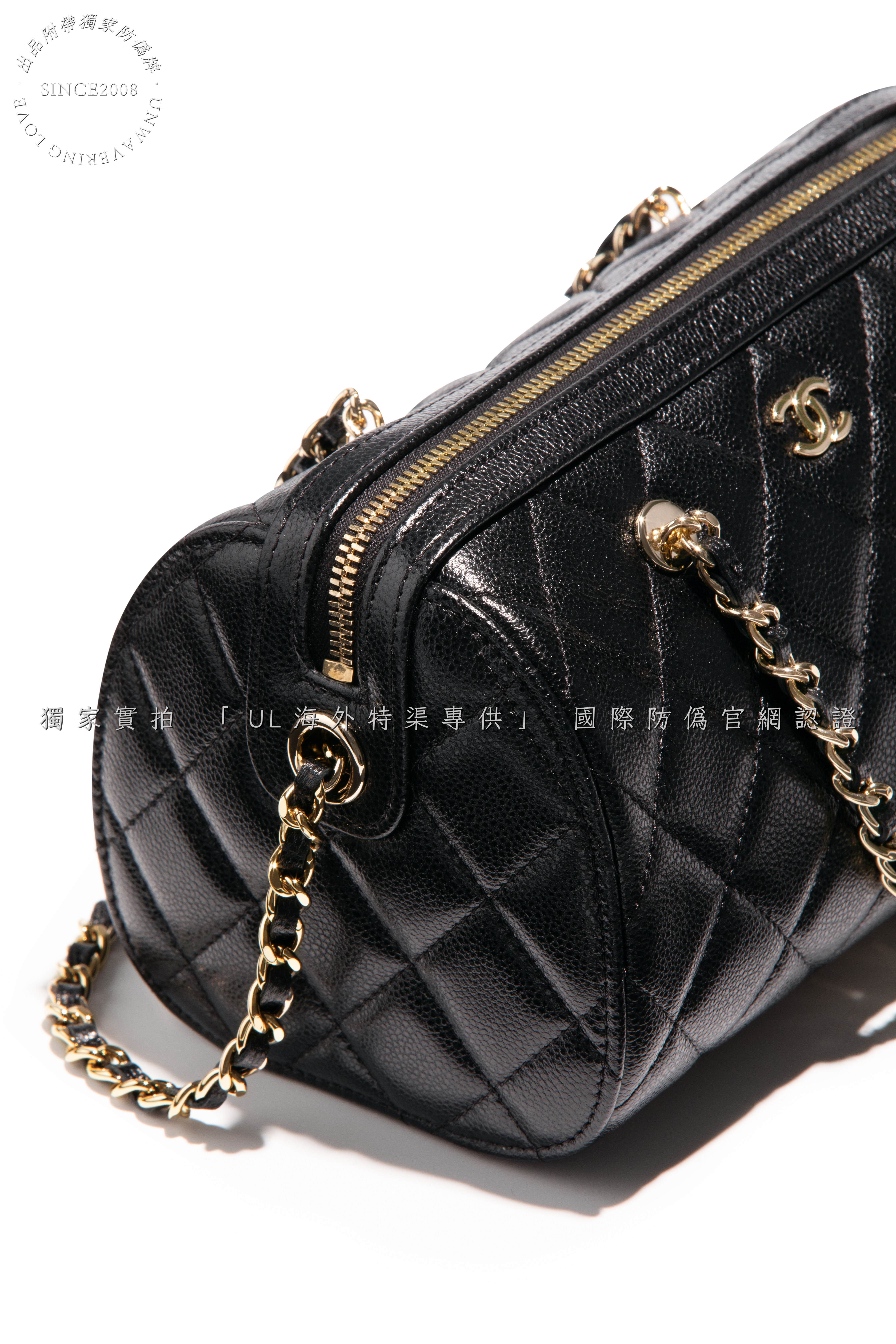 Secure double-zip closure with engraved "CHANEL" pull tabs.