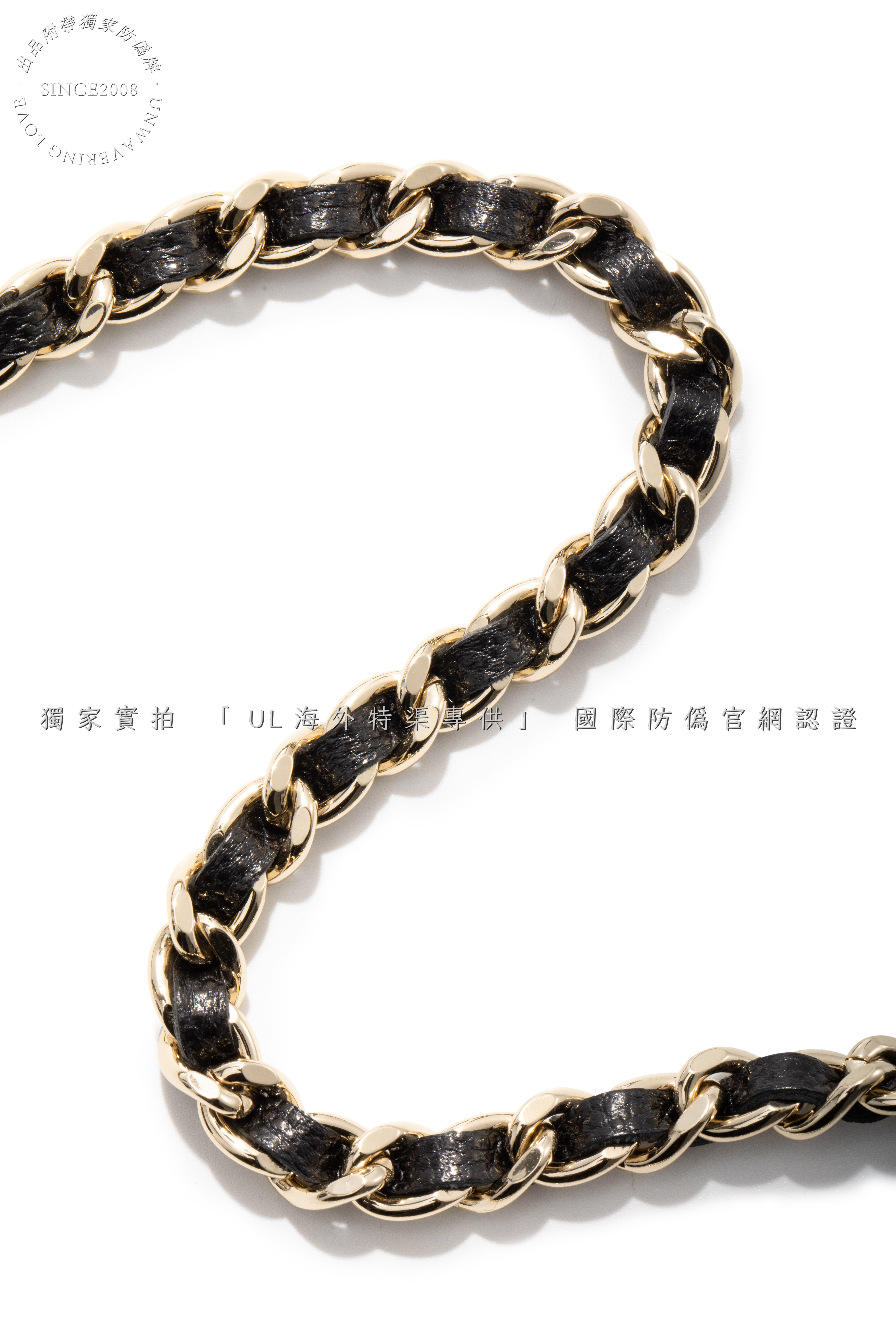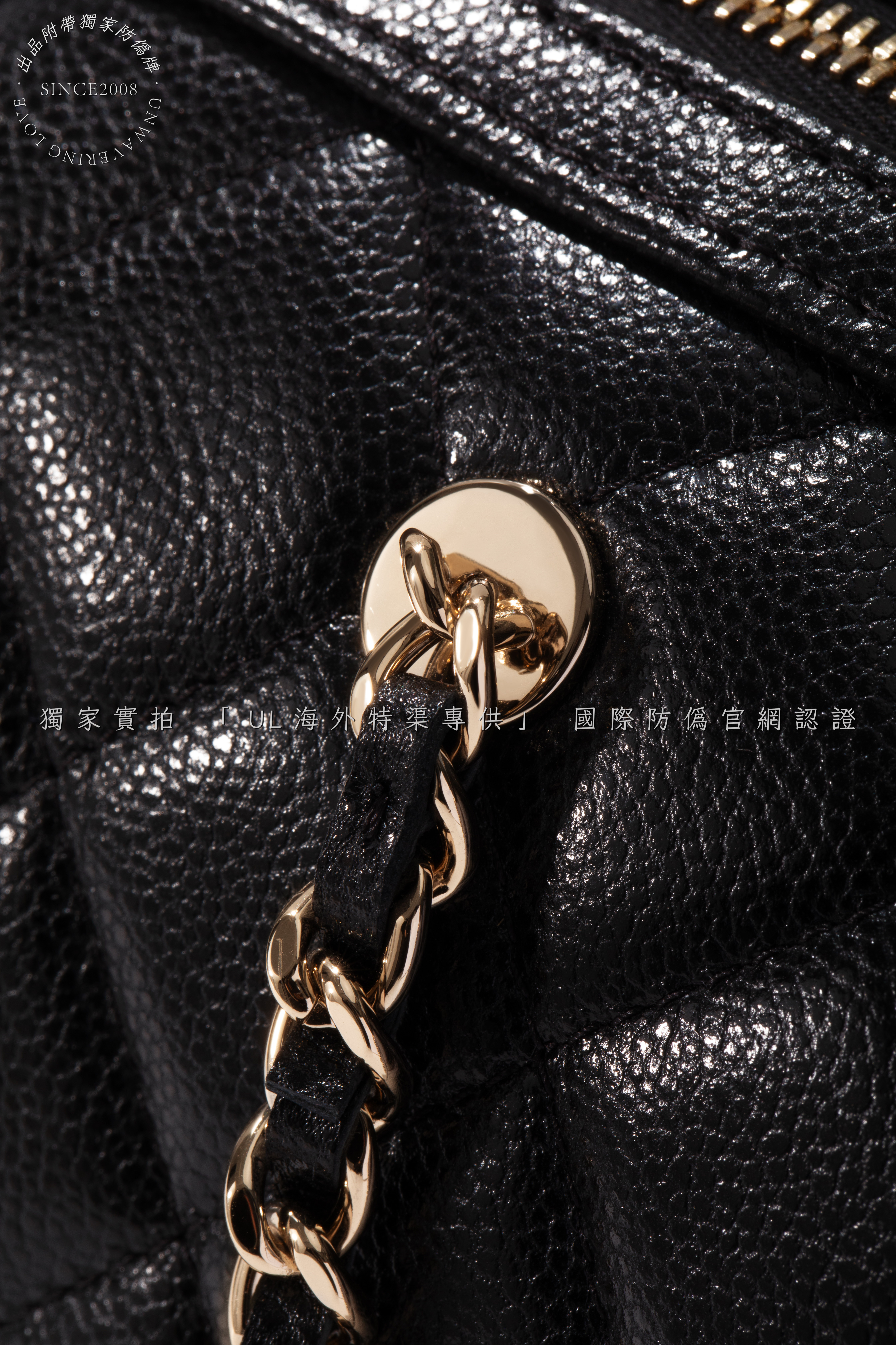 Antique gold-tone brass chains and engraved "CC" turn-lock, meticulously aged to evoke vintage allure .