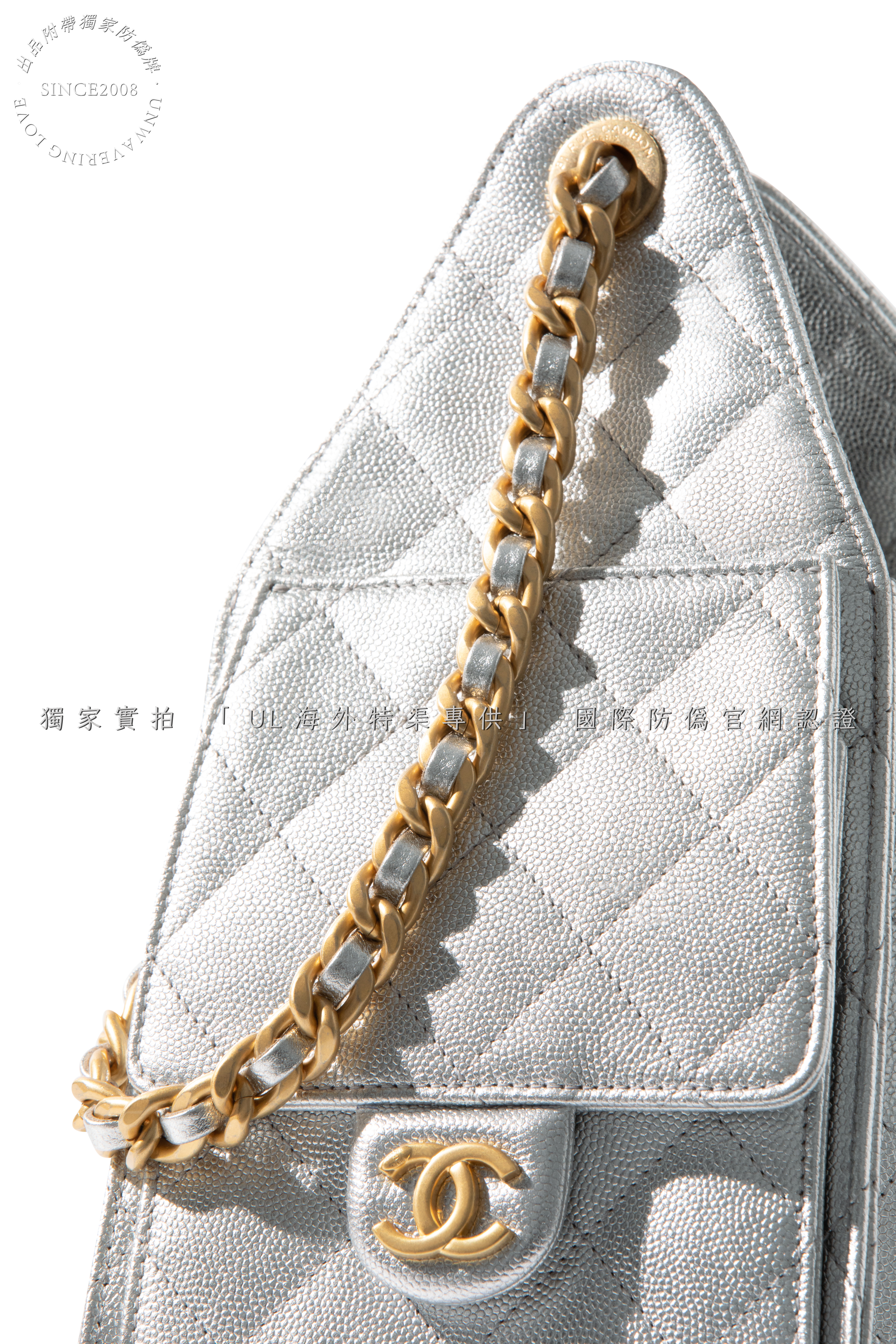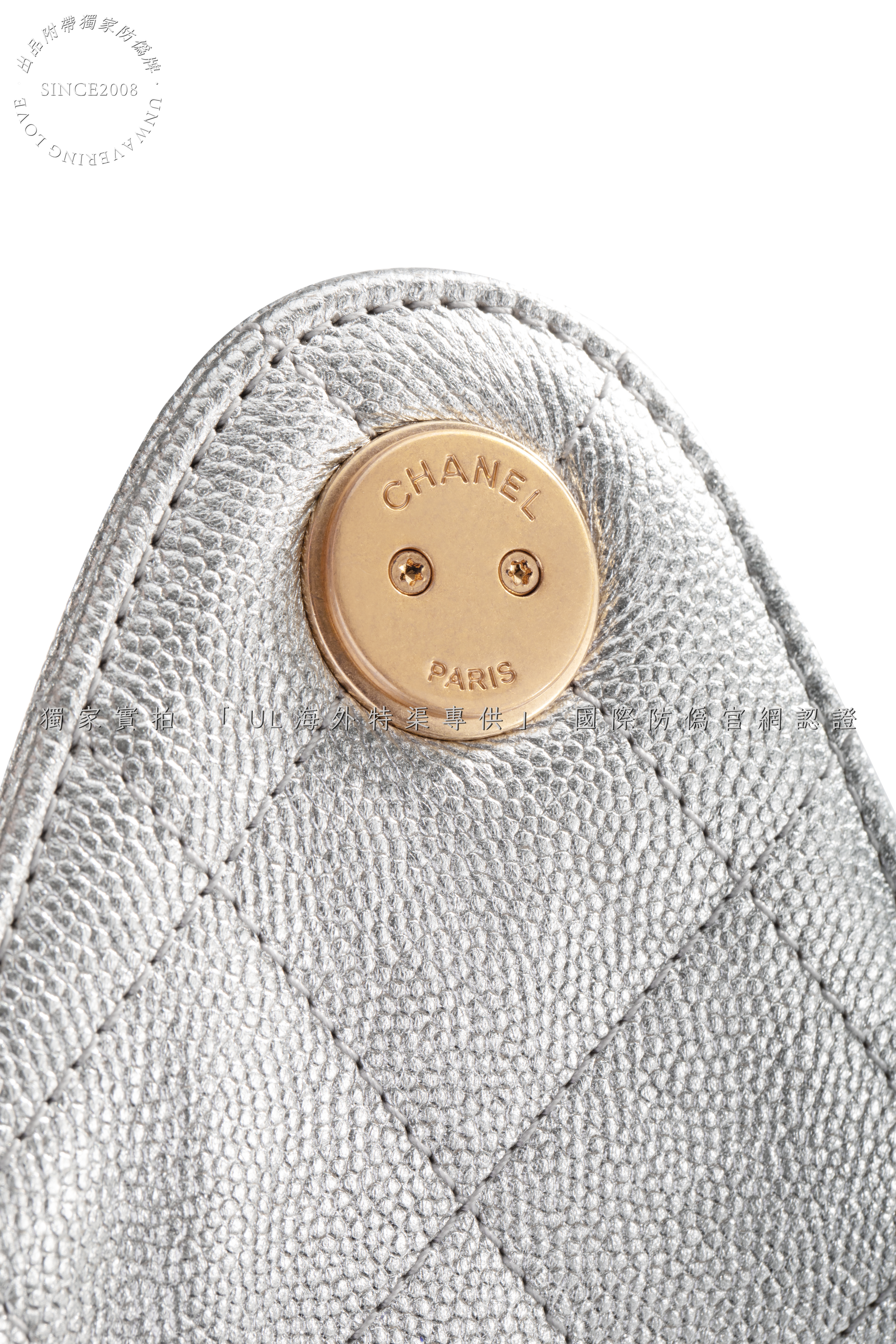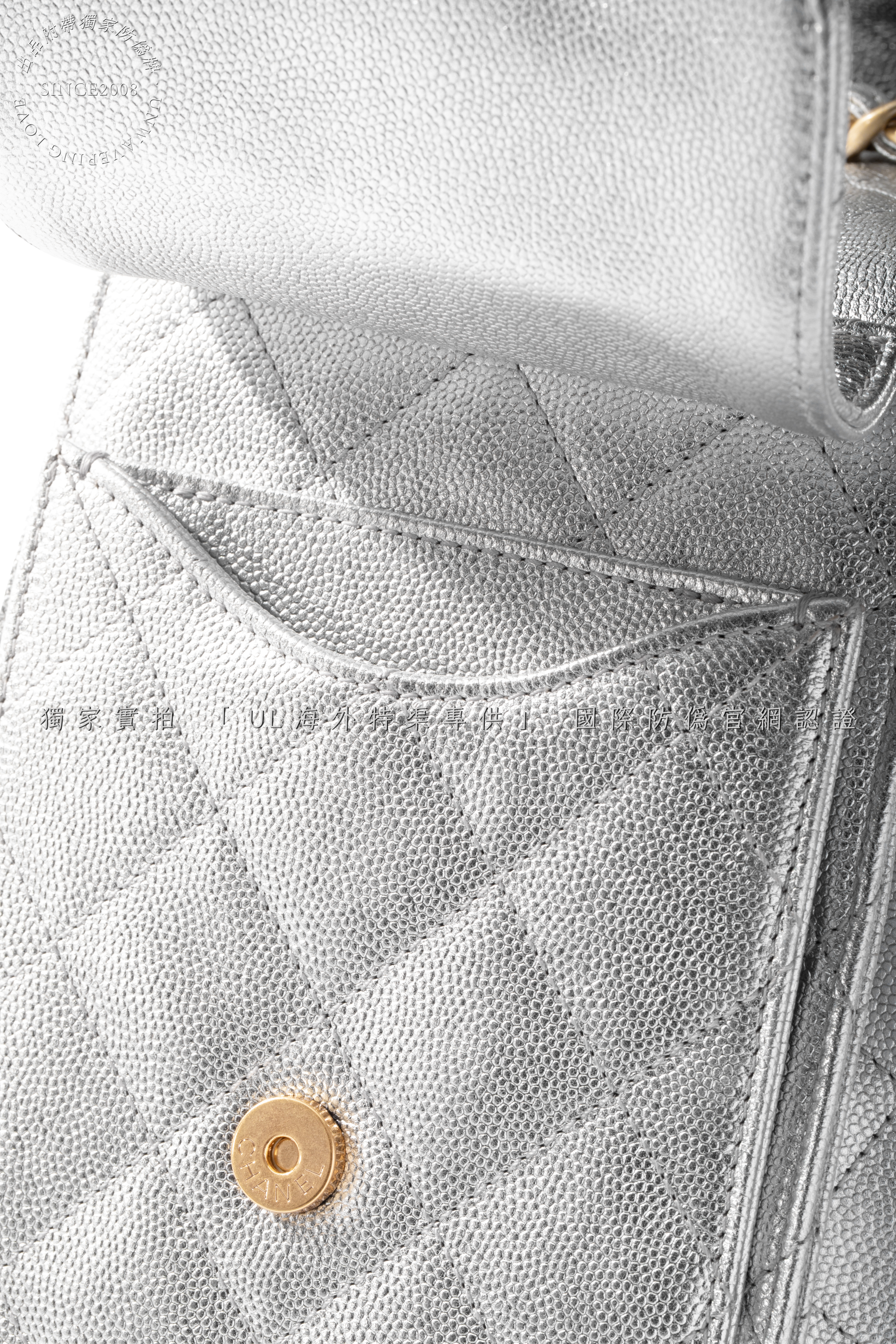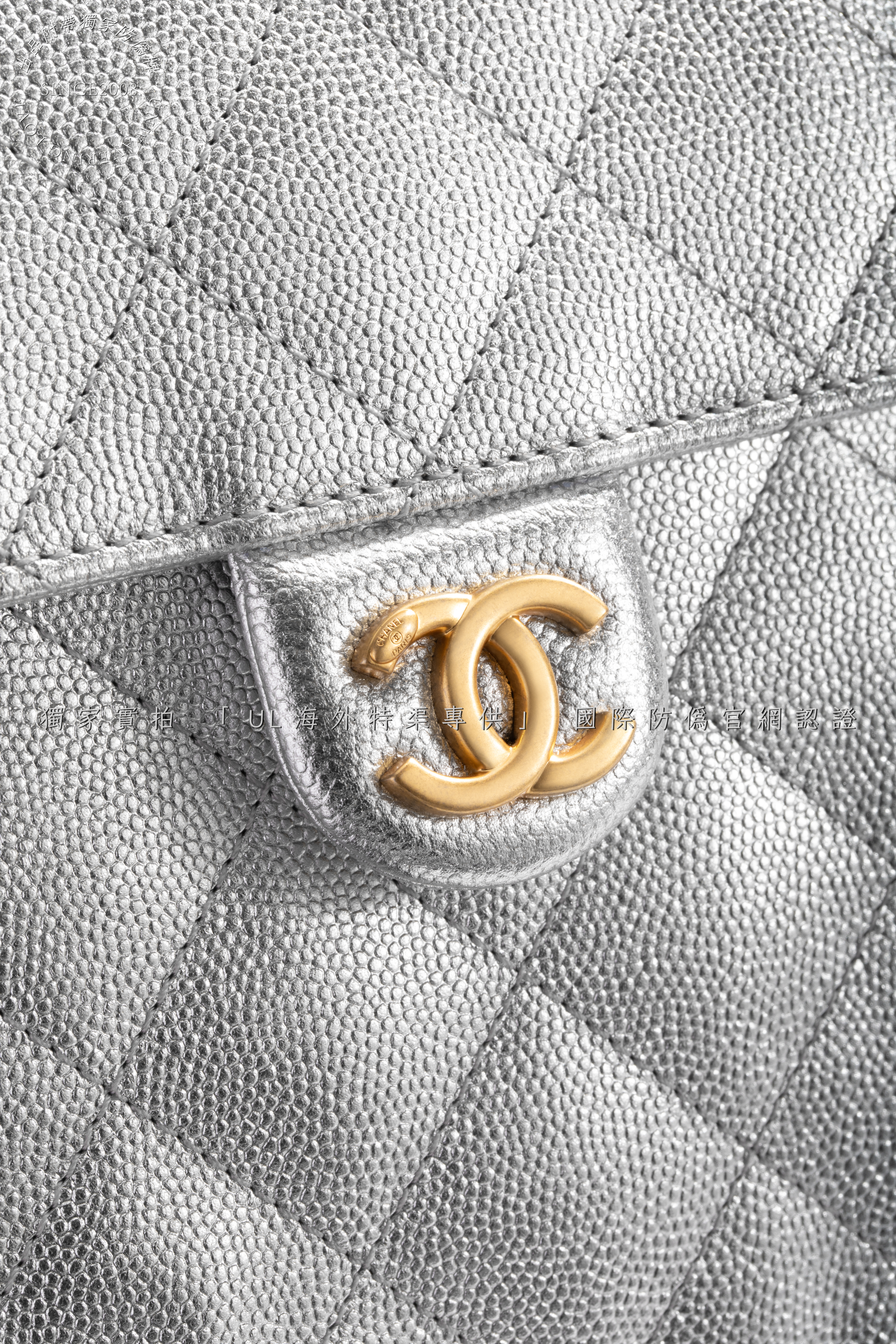 Crafted from the finest metallic lambskin leather, sourced from the same European tanneries supplying CHANEL, this ultra-lustrous material catches light with a liquid mercury glow. The cool silver hue merges futurism with classic refinement, while the diamond quilting showcases unparalleled depth and resilience.