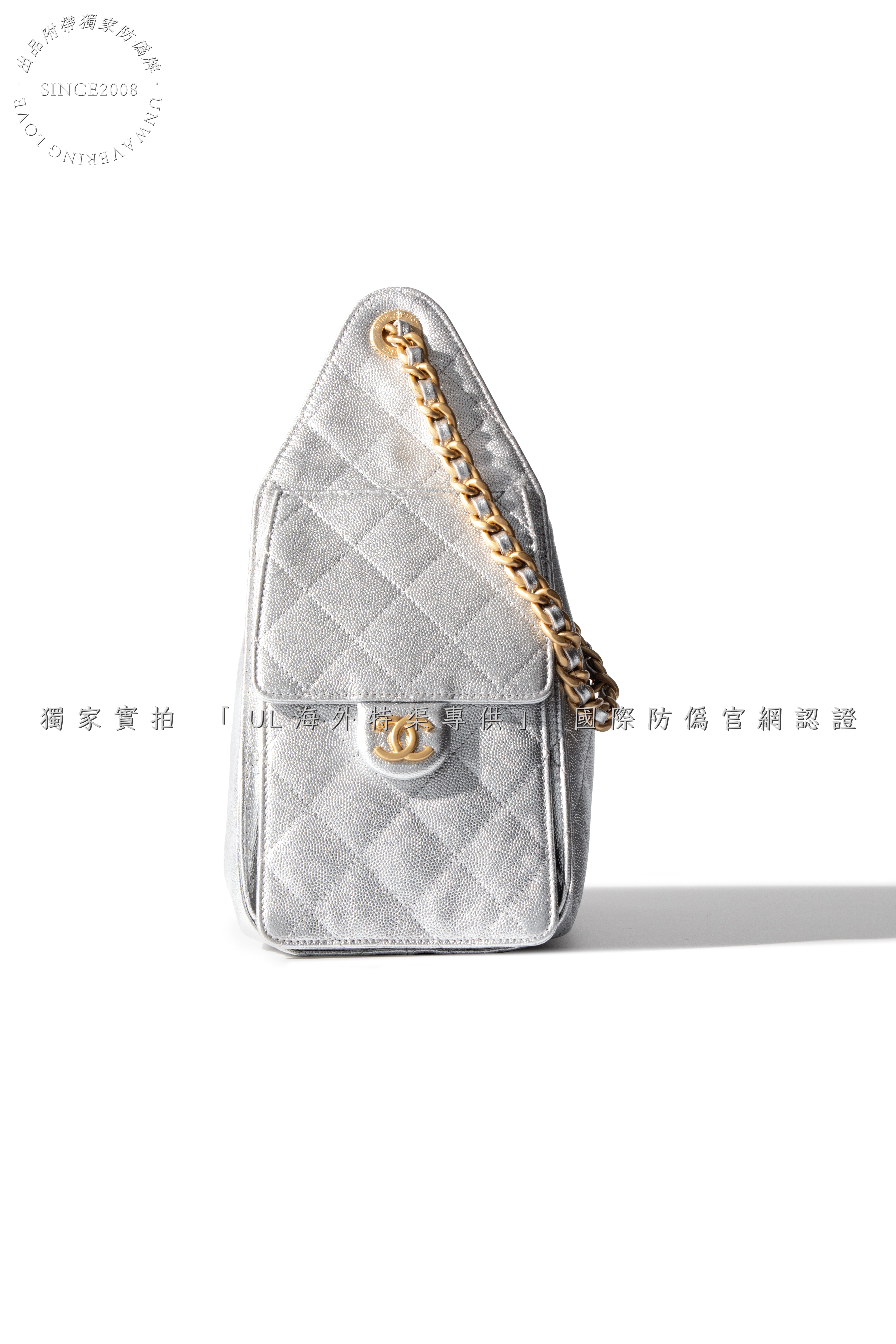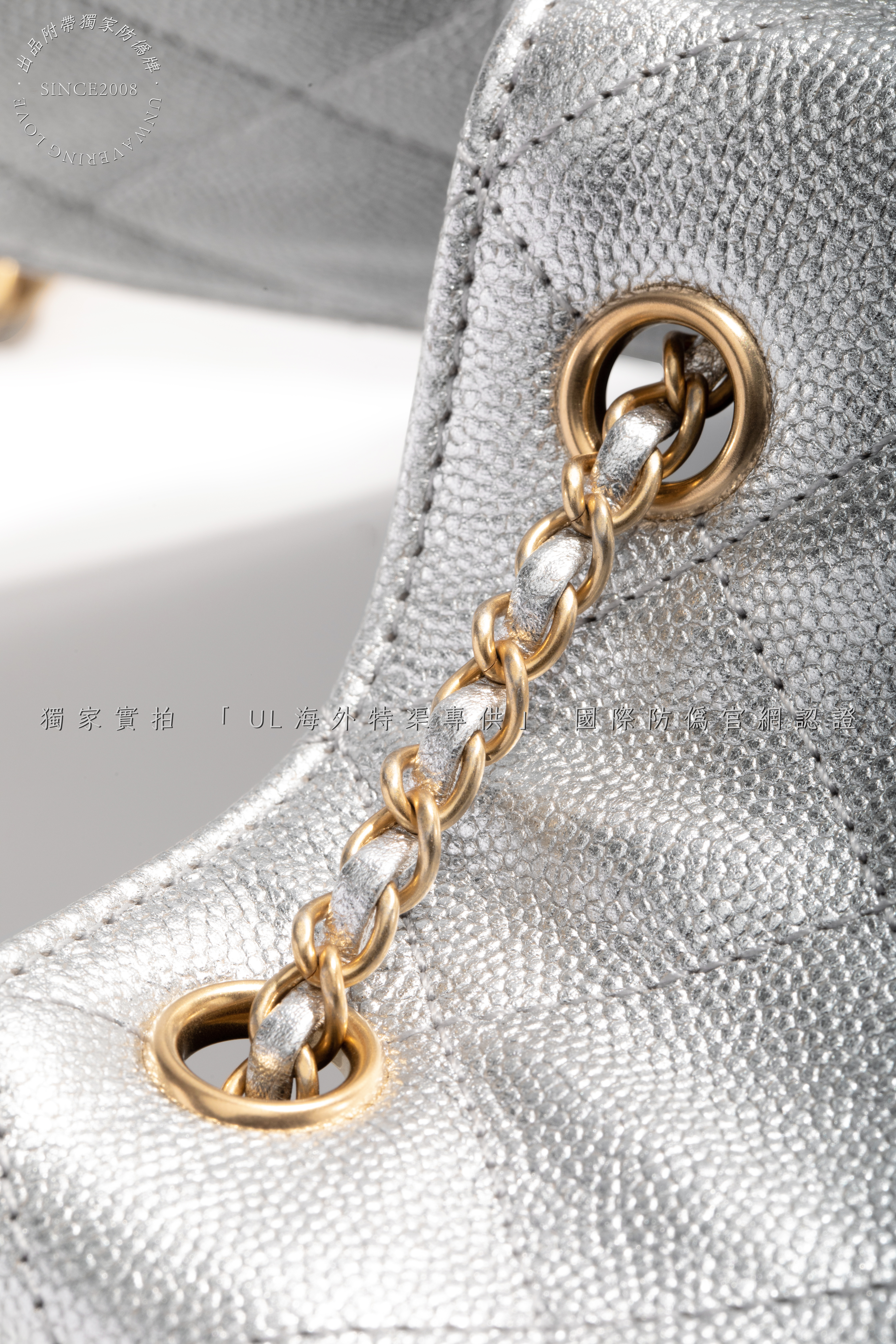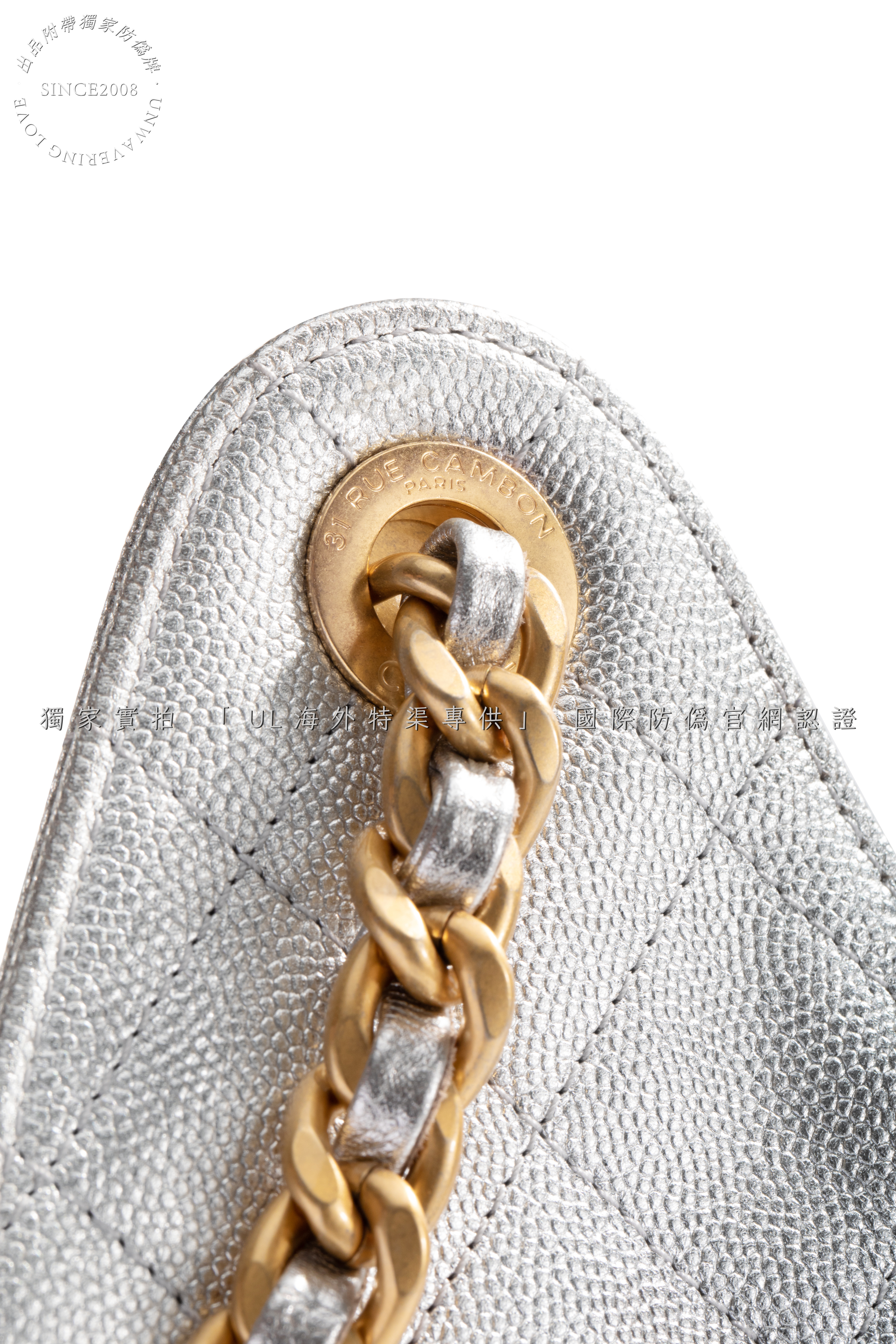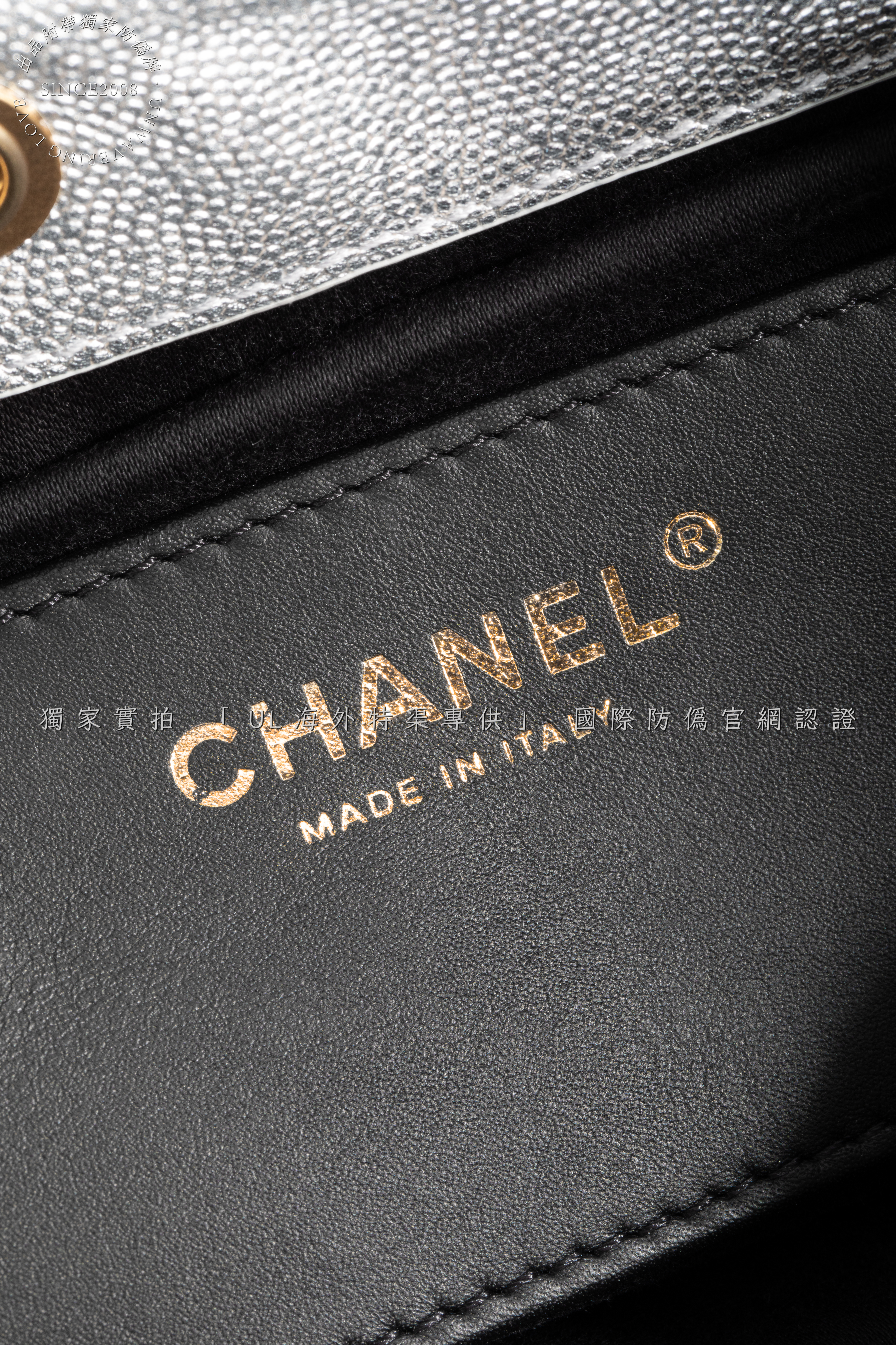 Crafted from the finest metallic lambskin leather, sourced from the same European tanneries supplying CHANEL, this ultra-lustrous material catches light with a liquid mercury glow. The cool silver hue merges futurism with classic refinement, while the diamond quilting showcases unparalleled depth and resilience.
