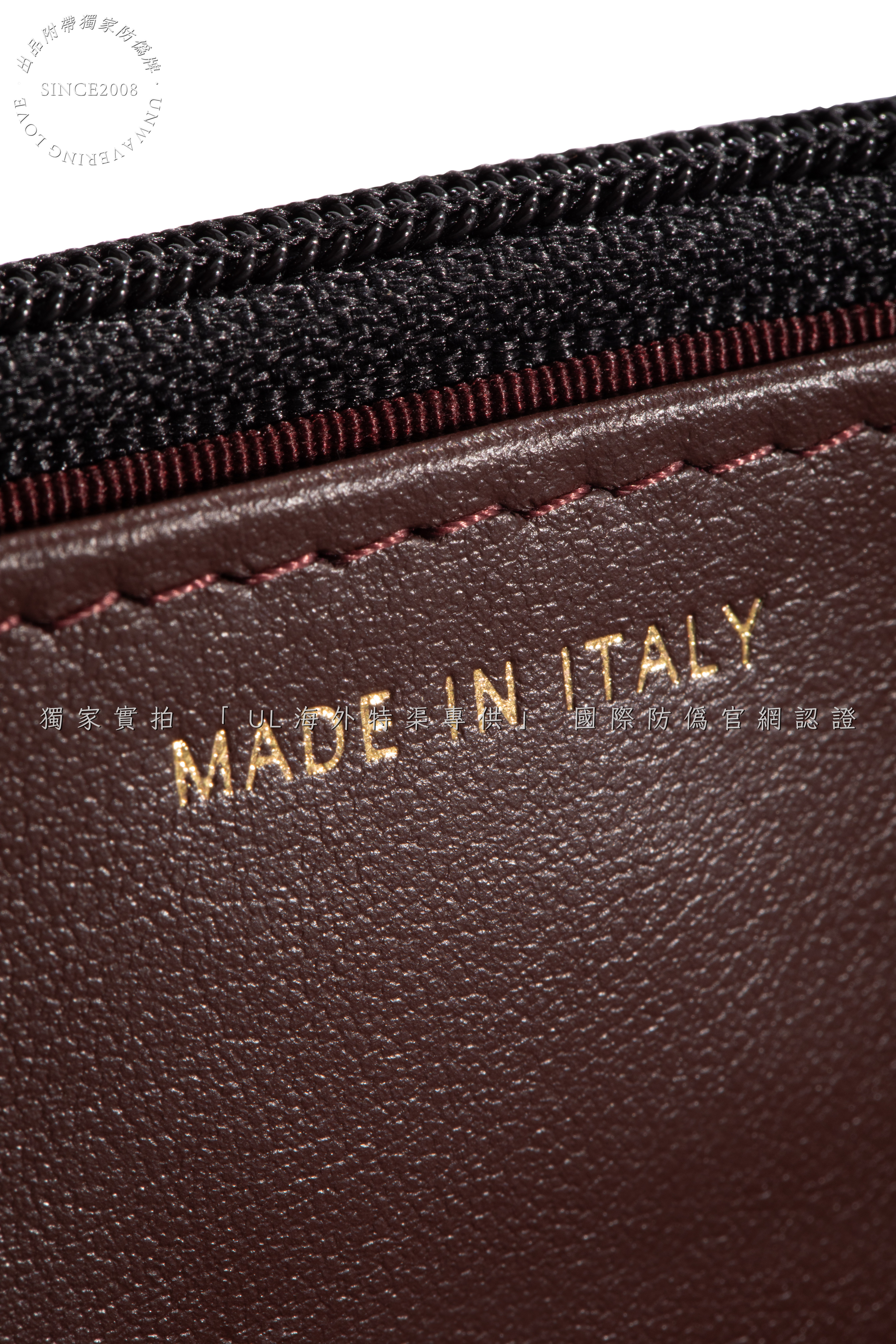 Lining: Luxe burgundy leather interior with card slots and zipped pocket