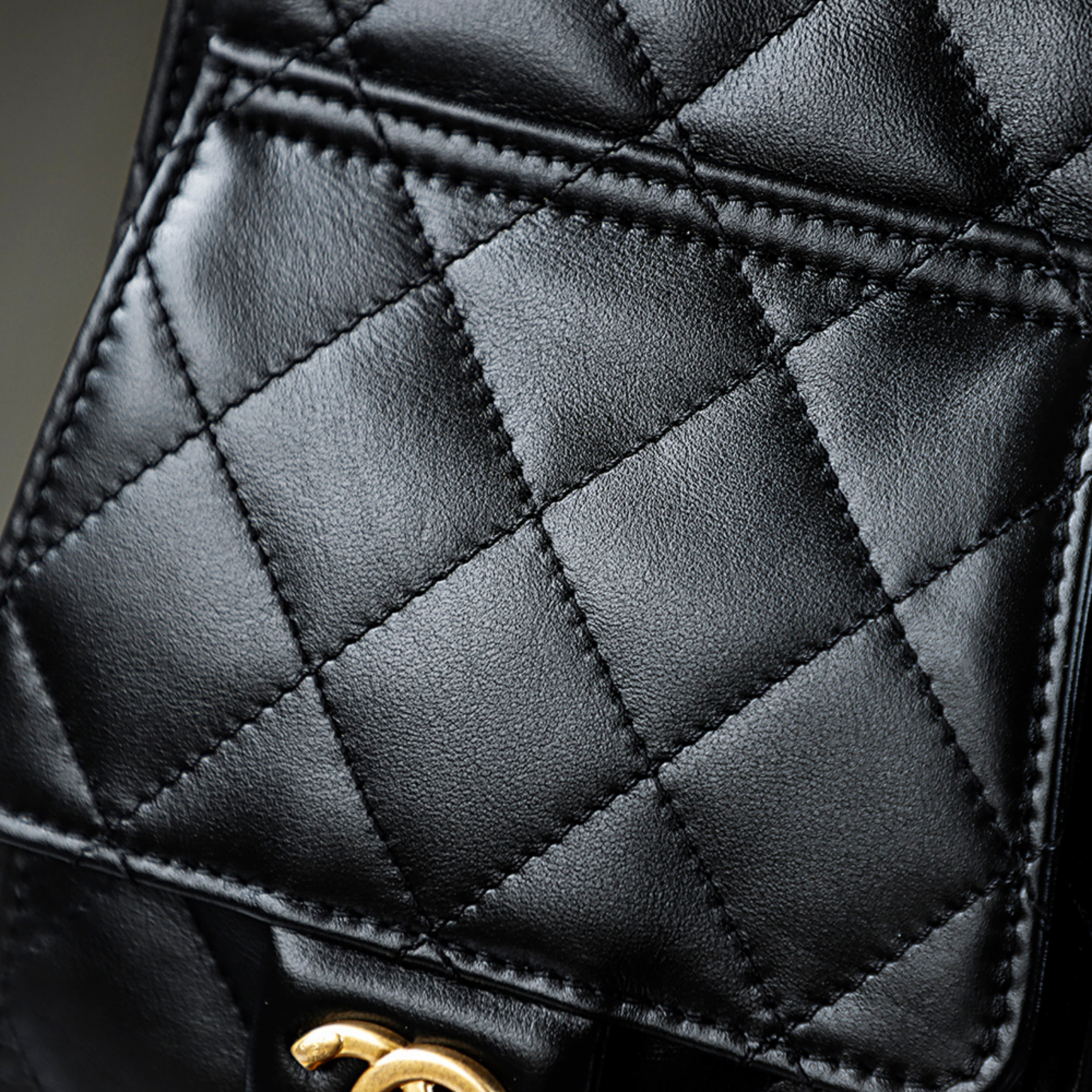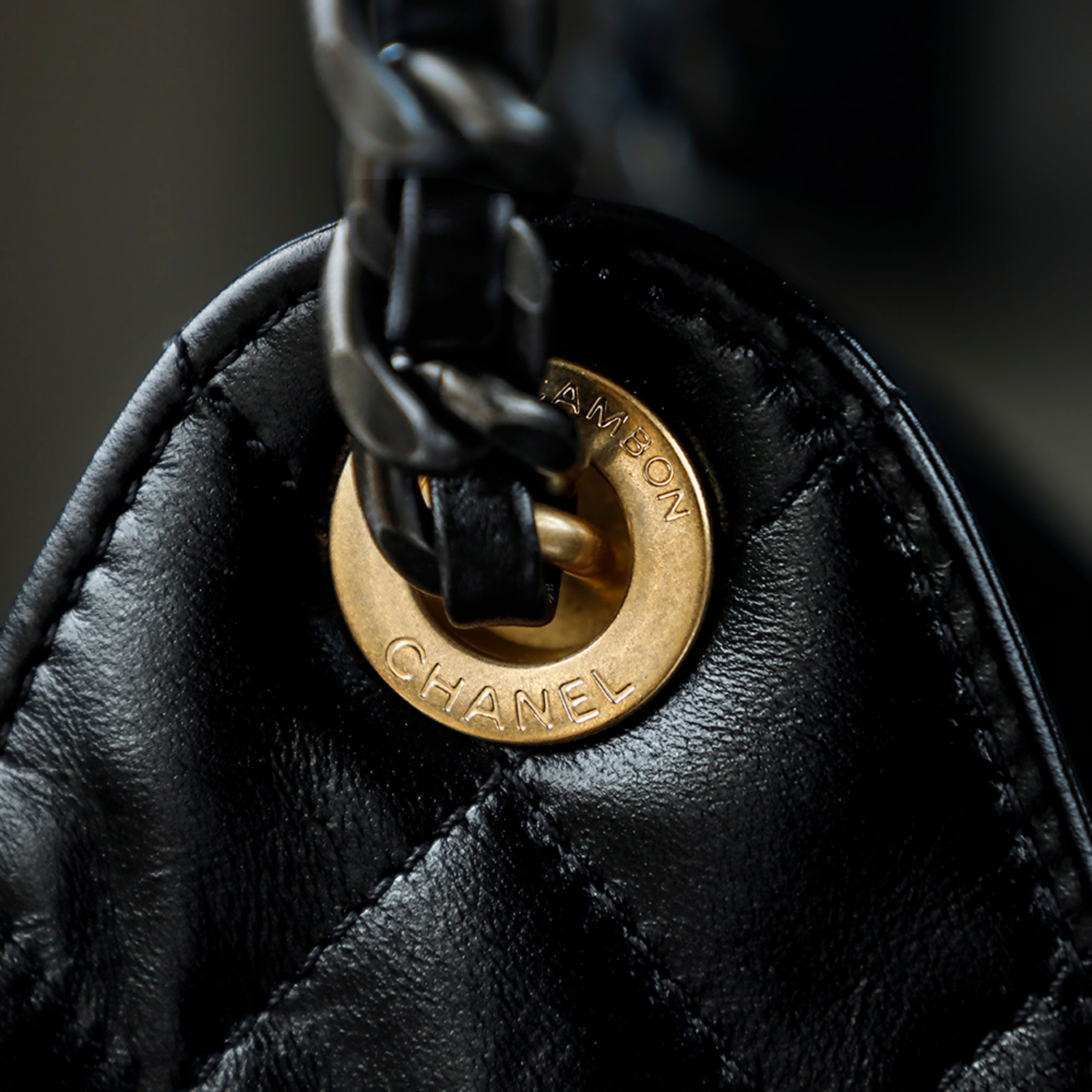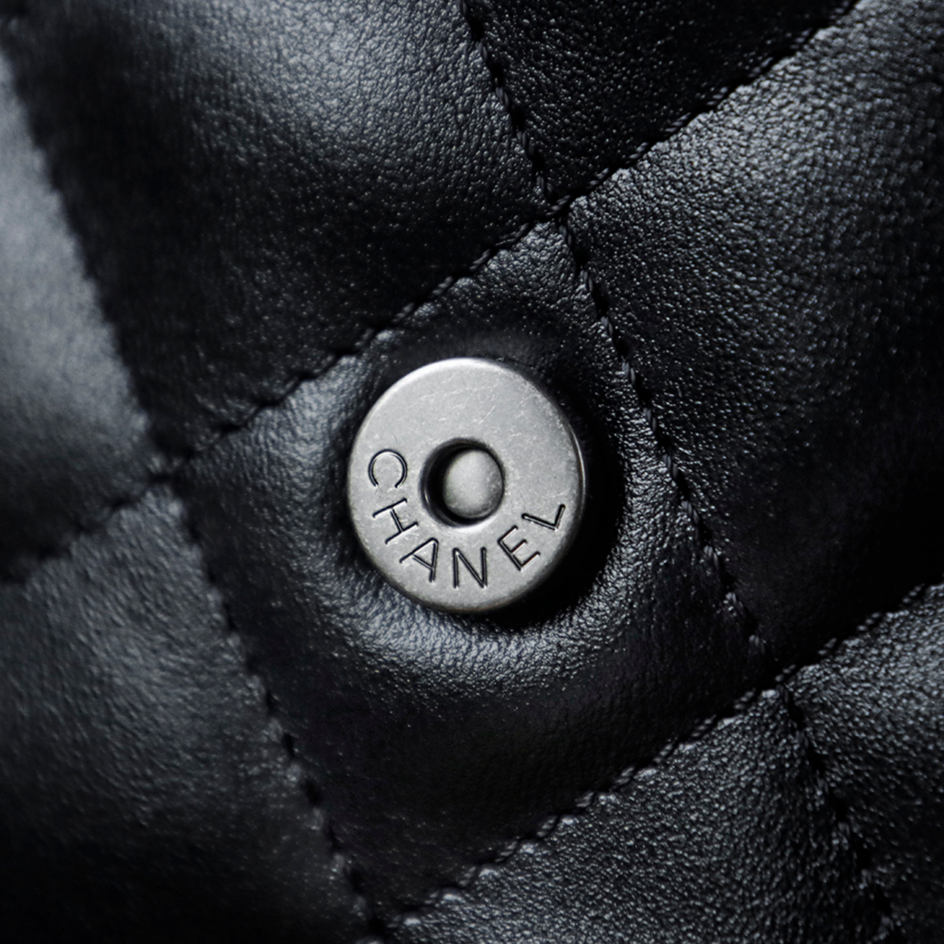 Crafted from superior black caviar leather, known for its durable yet supple texture and subtle sheen, this material offers exceptional resistance to scratches while maintaining a luxurious feel. Sourced from esteemed tanneries aligned with Chanel’s standards, the leather ensures the bag retains its structured shape and timeless appeal over time.