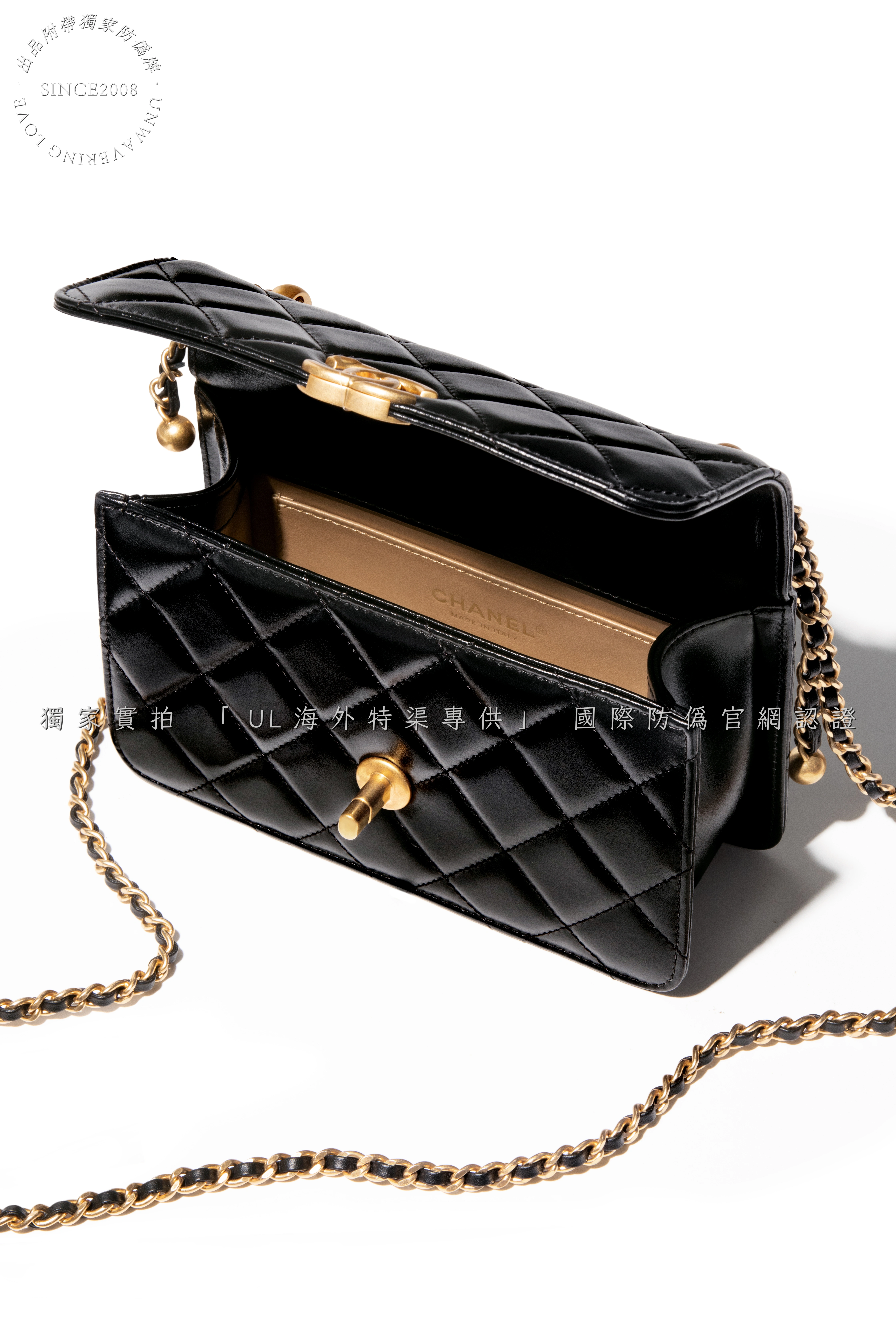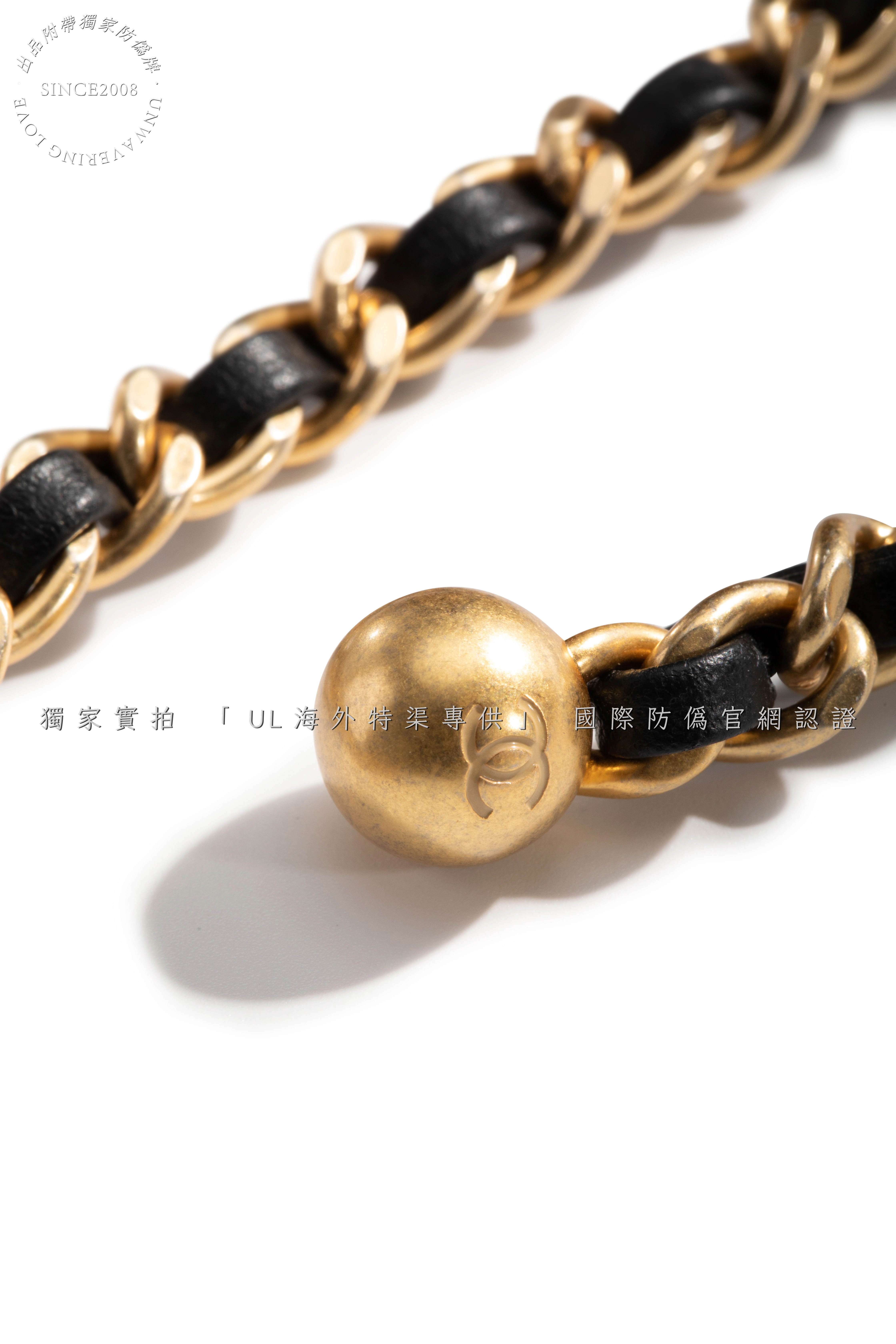 • Double gold ball chain and CC turn-lock crafted from solid metal, then electroplated in 24K gold for a mirror-like luster.