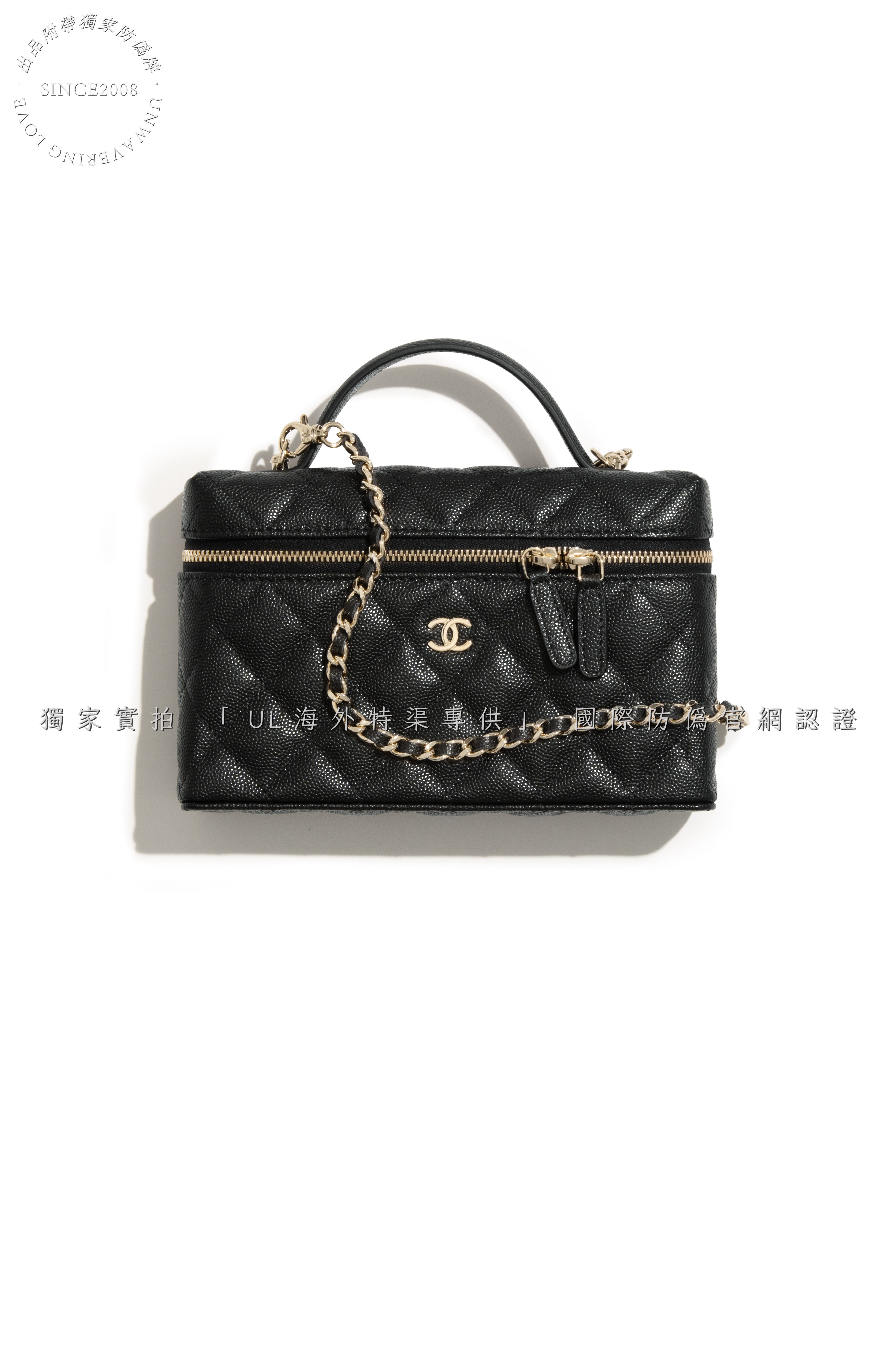 Design Features: Structured box silhouette, iconic CC turn-lock closure, detachable chain strap, dual carrying options (top handle + shoulder strap)