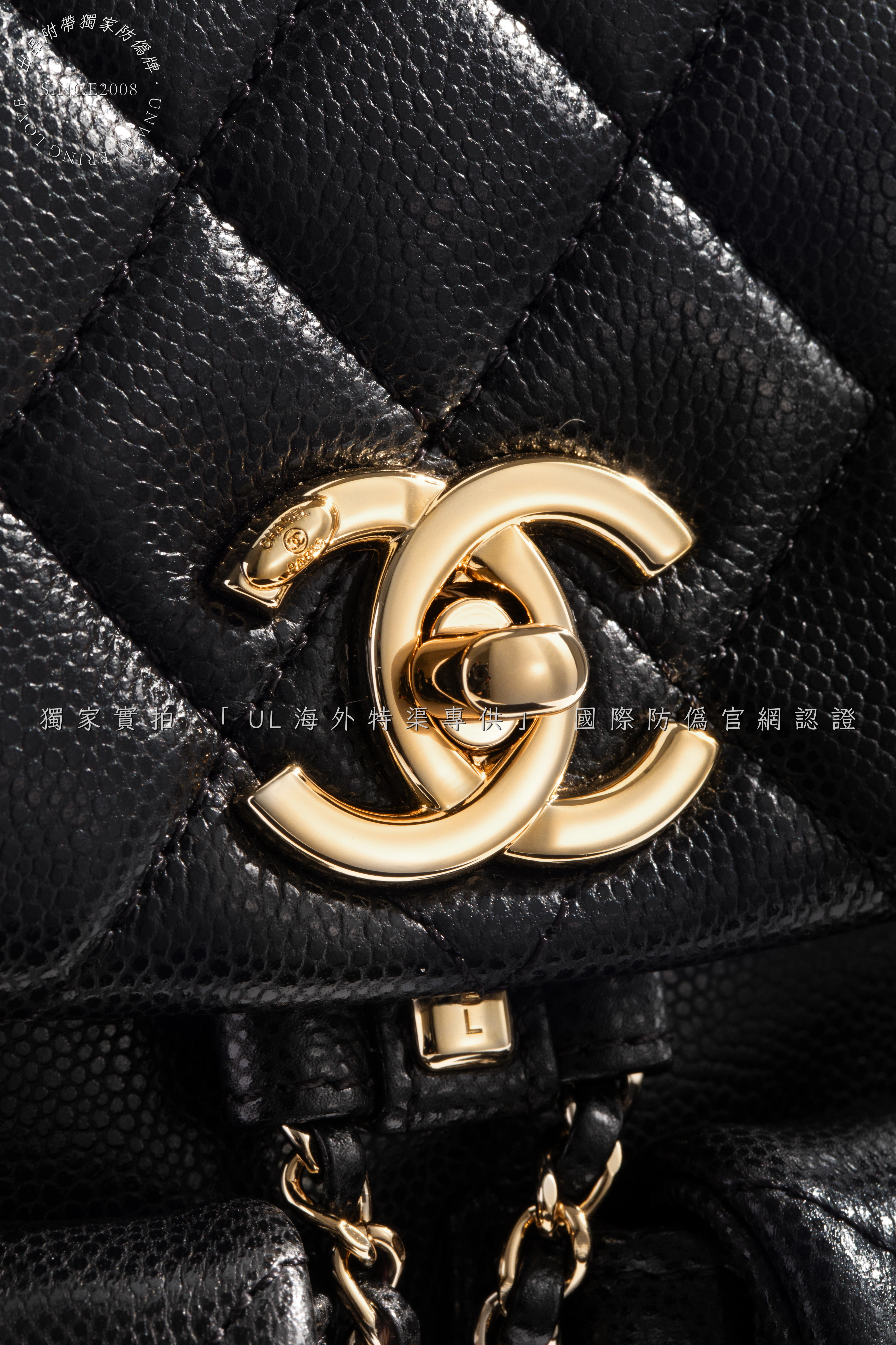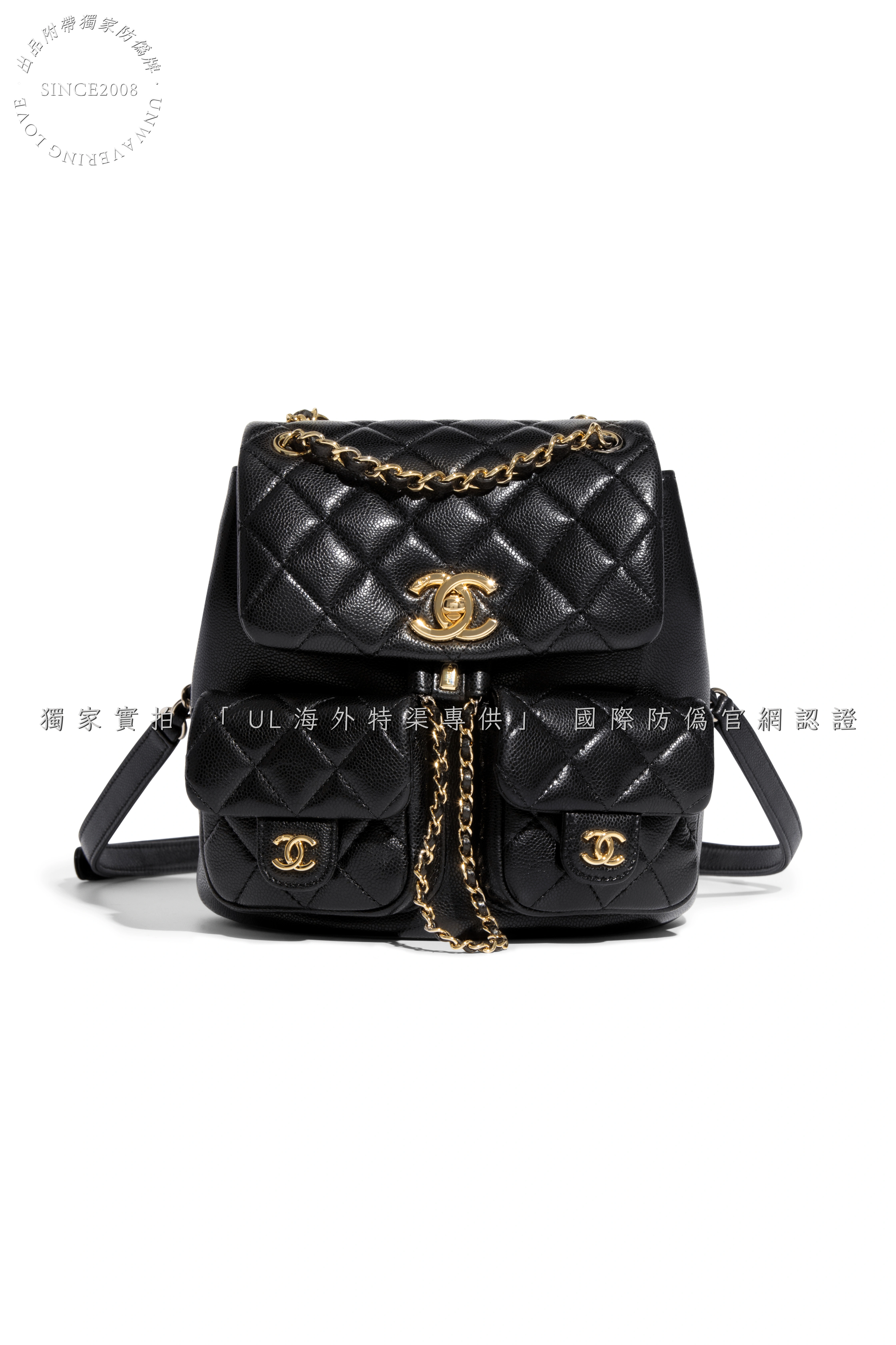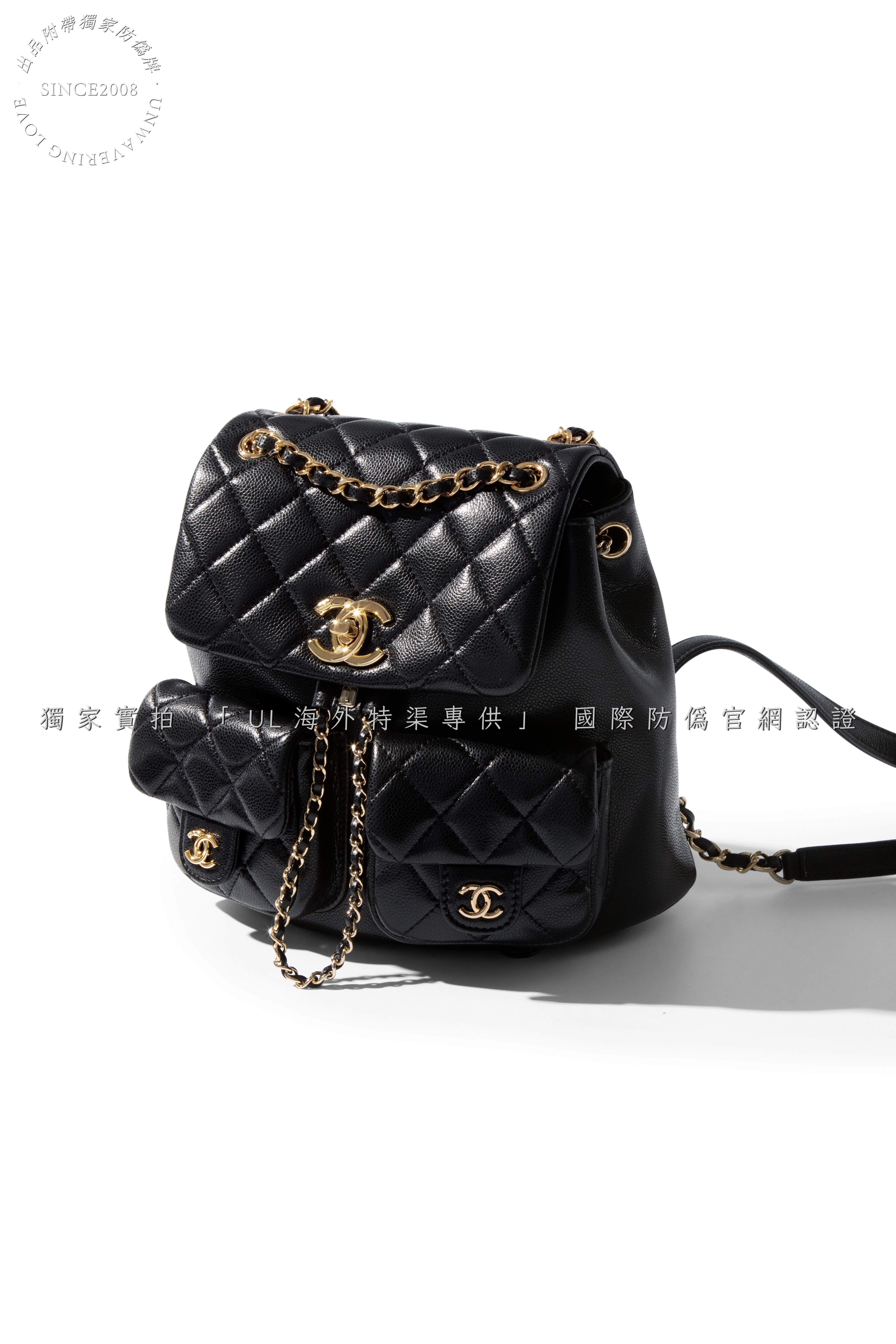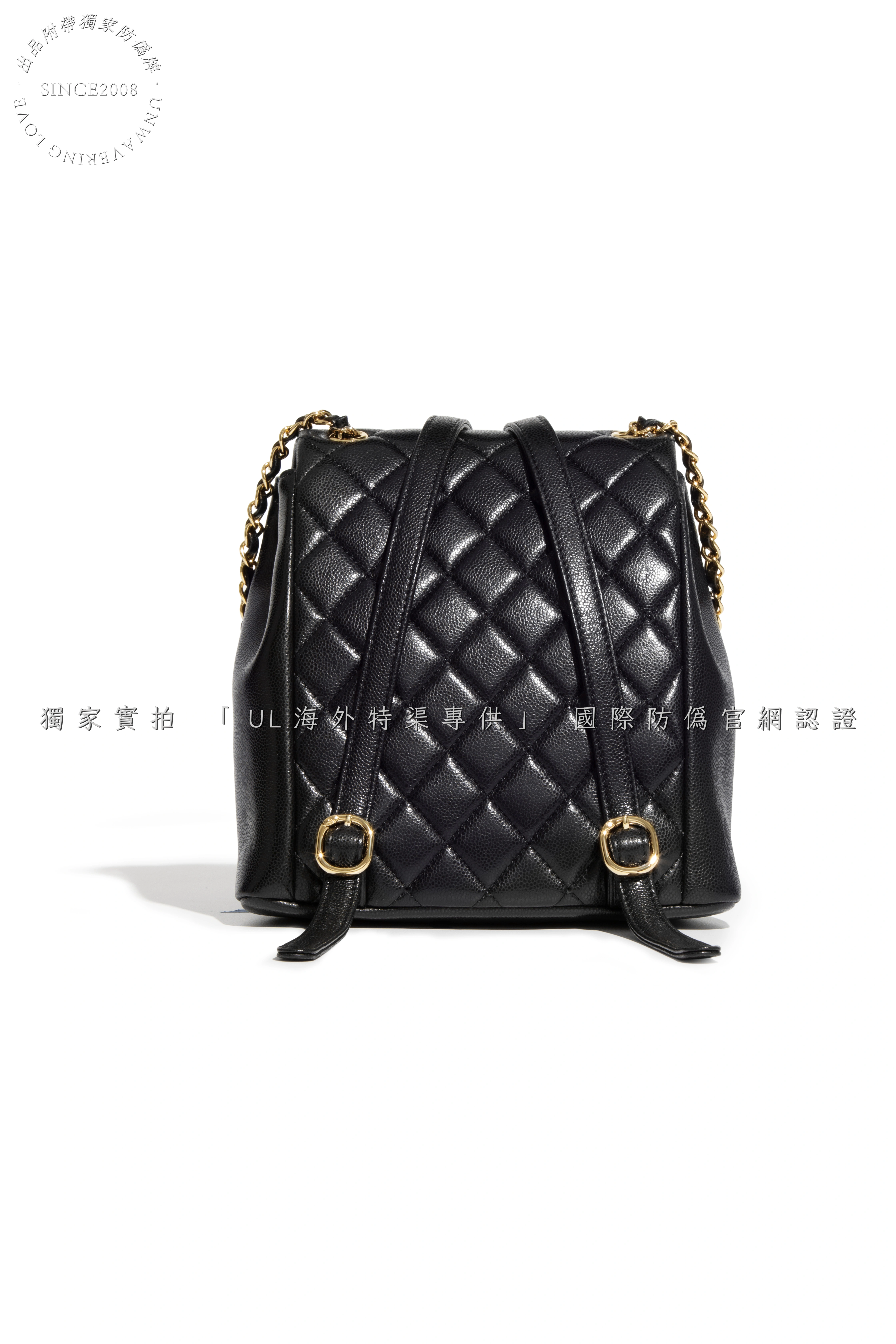 Design Features: Dual adjustable straps, signature quilted stitching, top zip closure, front decorative CC turn-lock, and sleek backpack silhouette