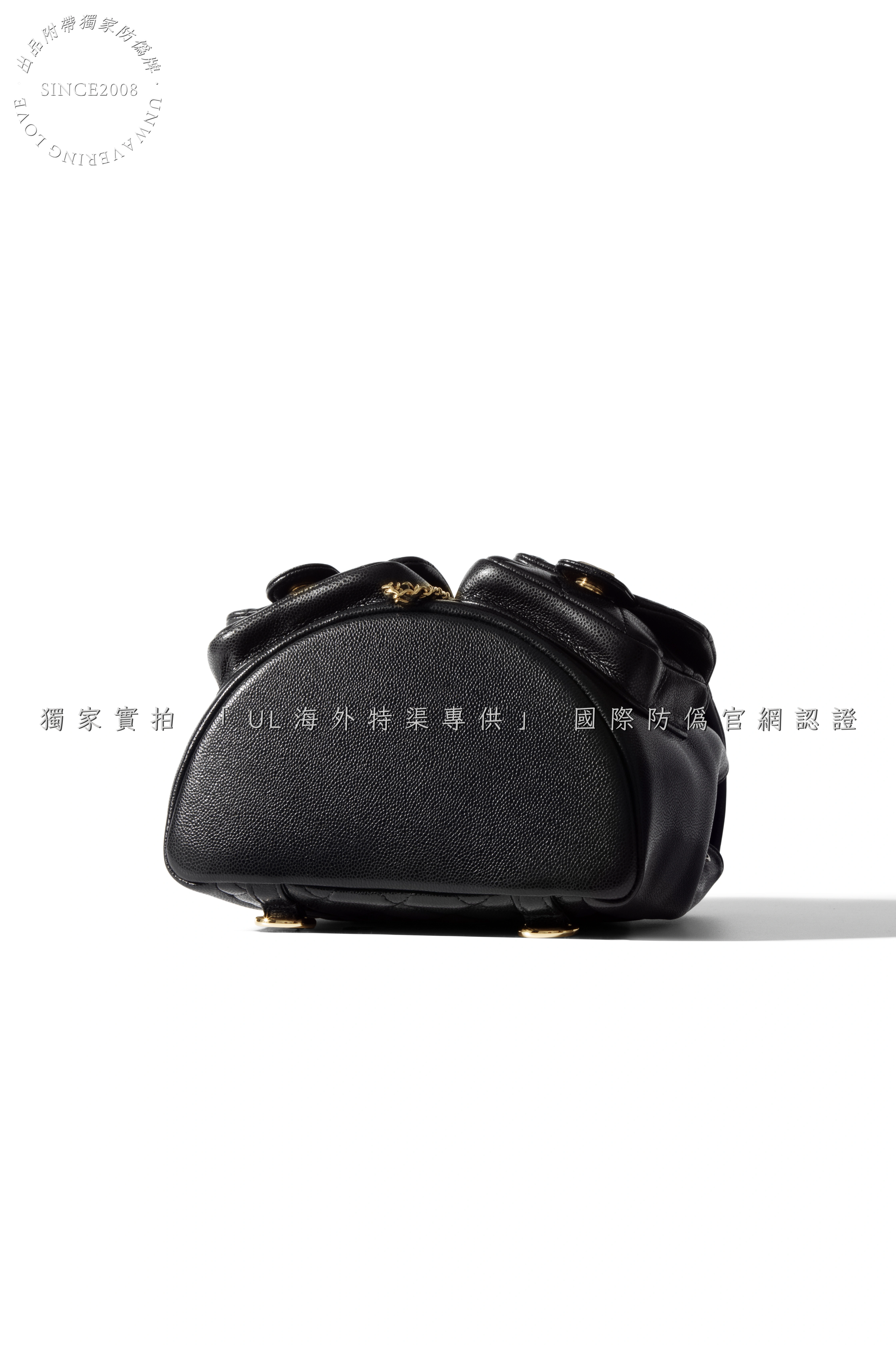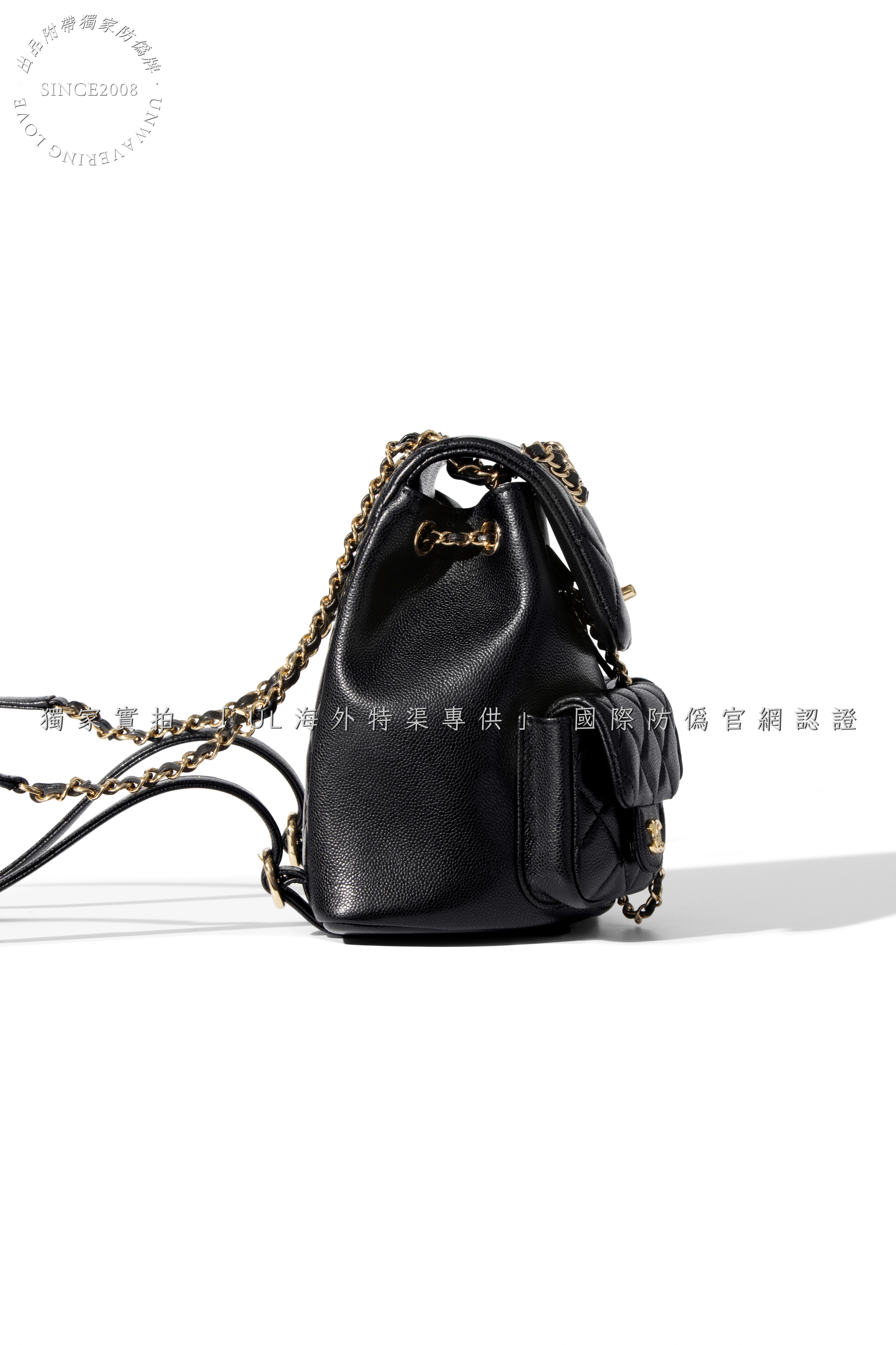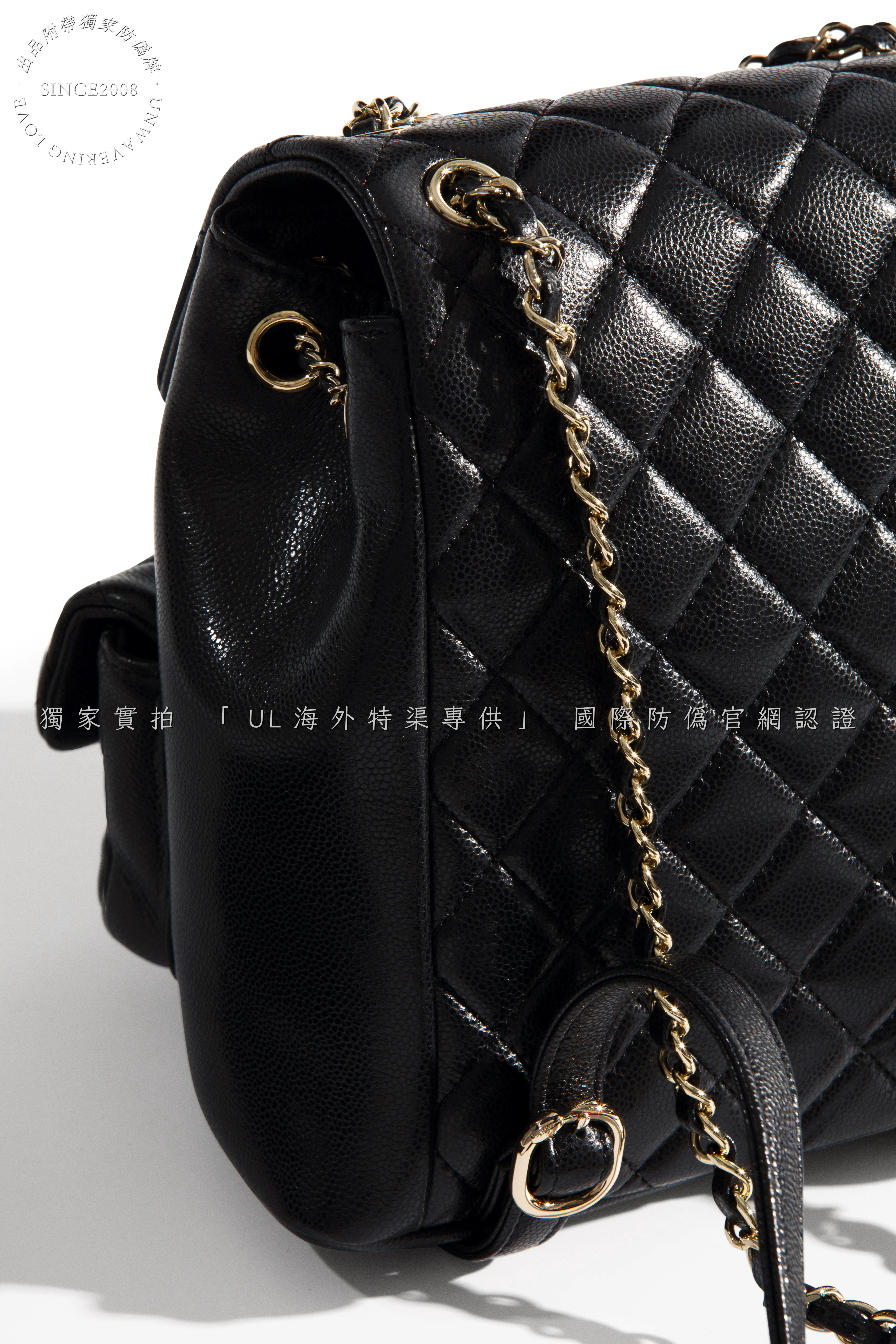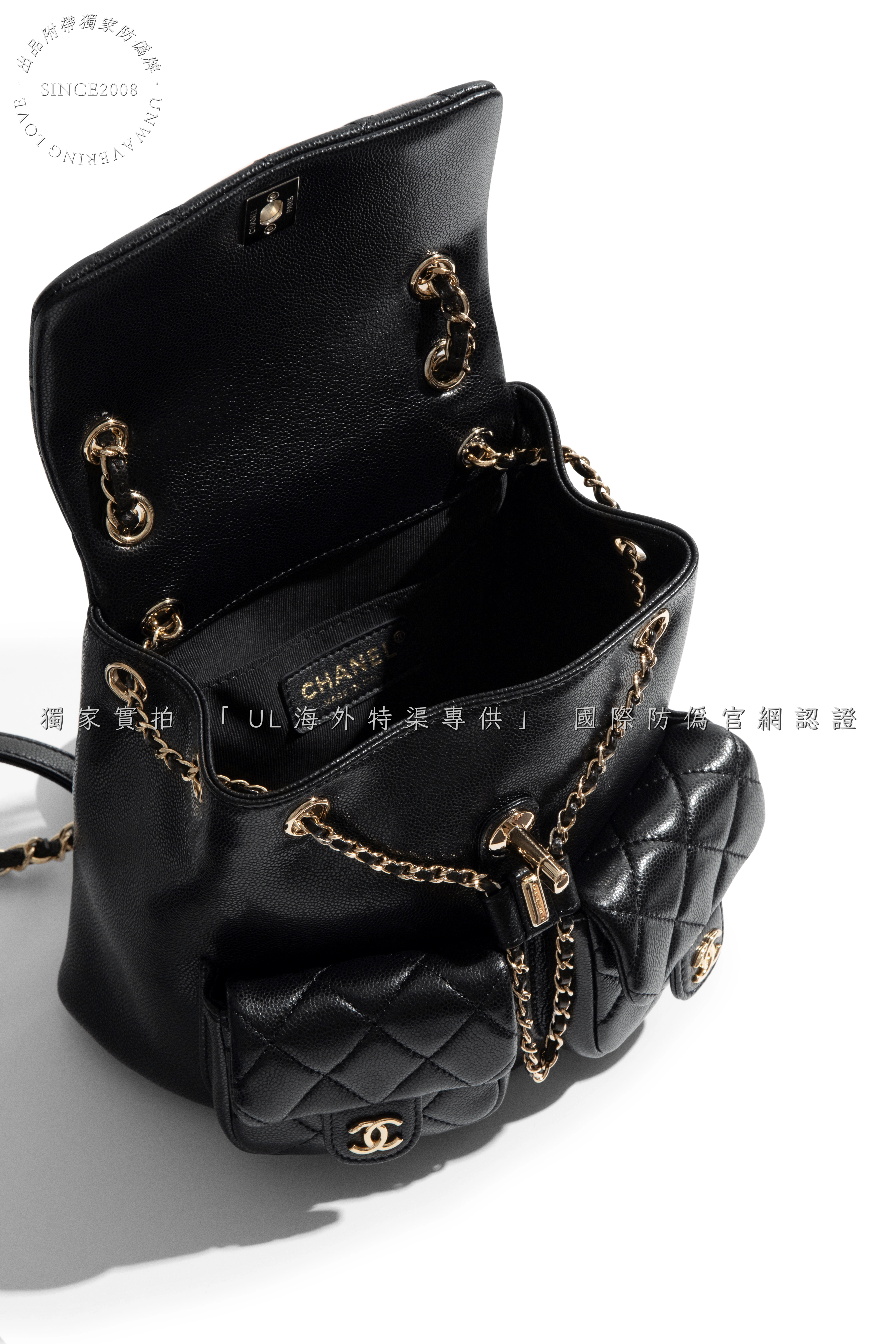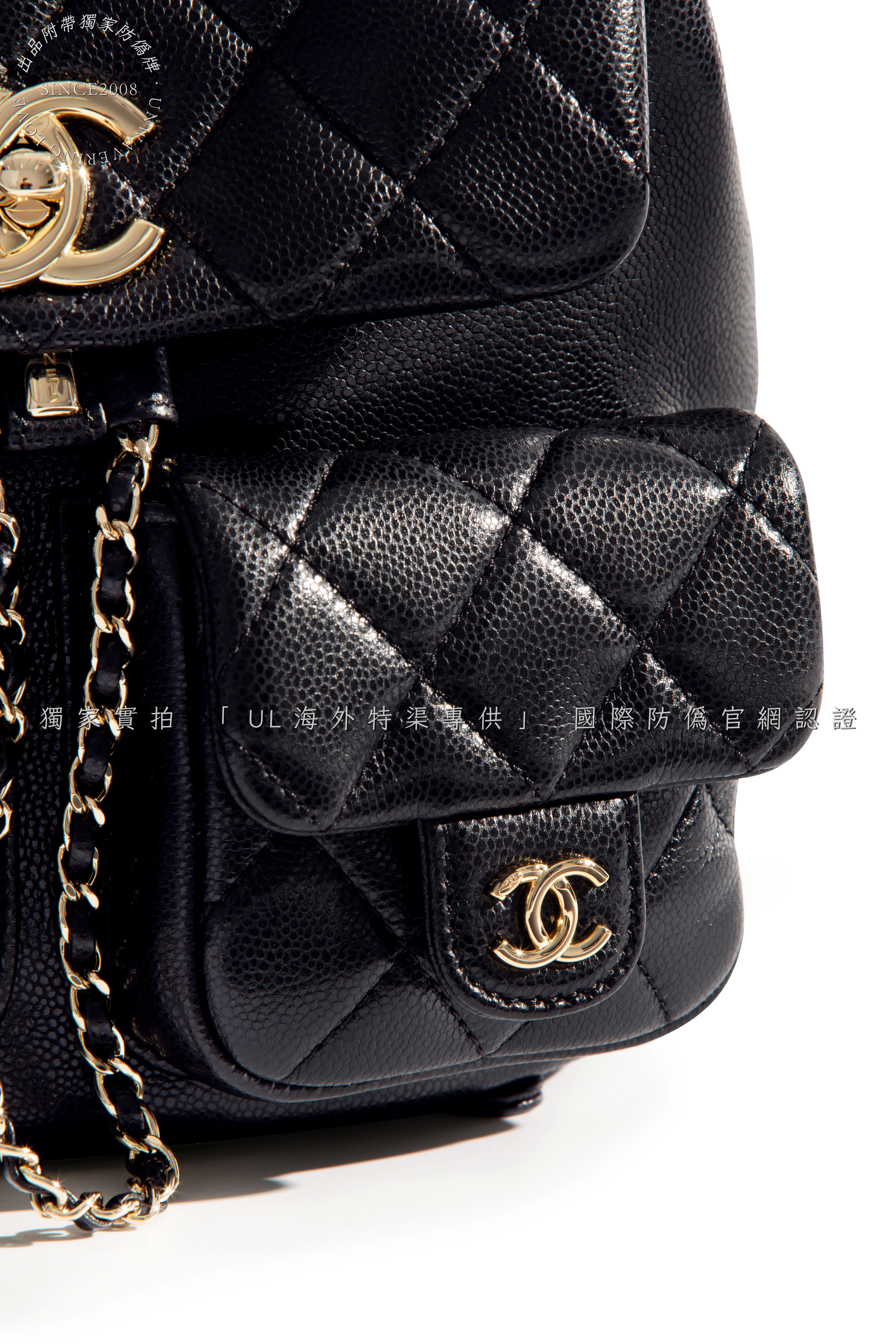 Design Features: Dual adjustable straps, signature quilted stitching, top zip closure, front decorative CC turn-lock, and sleek backpack silhouette