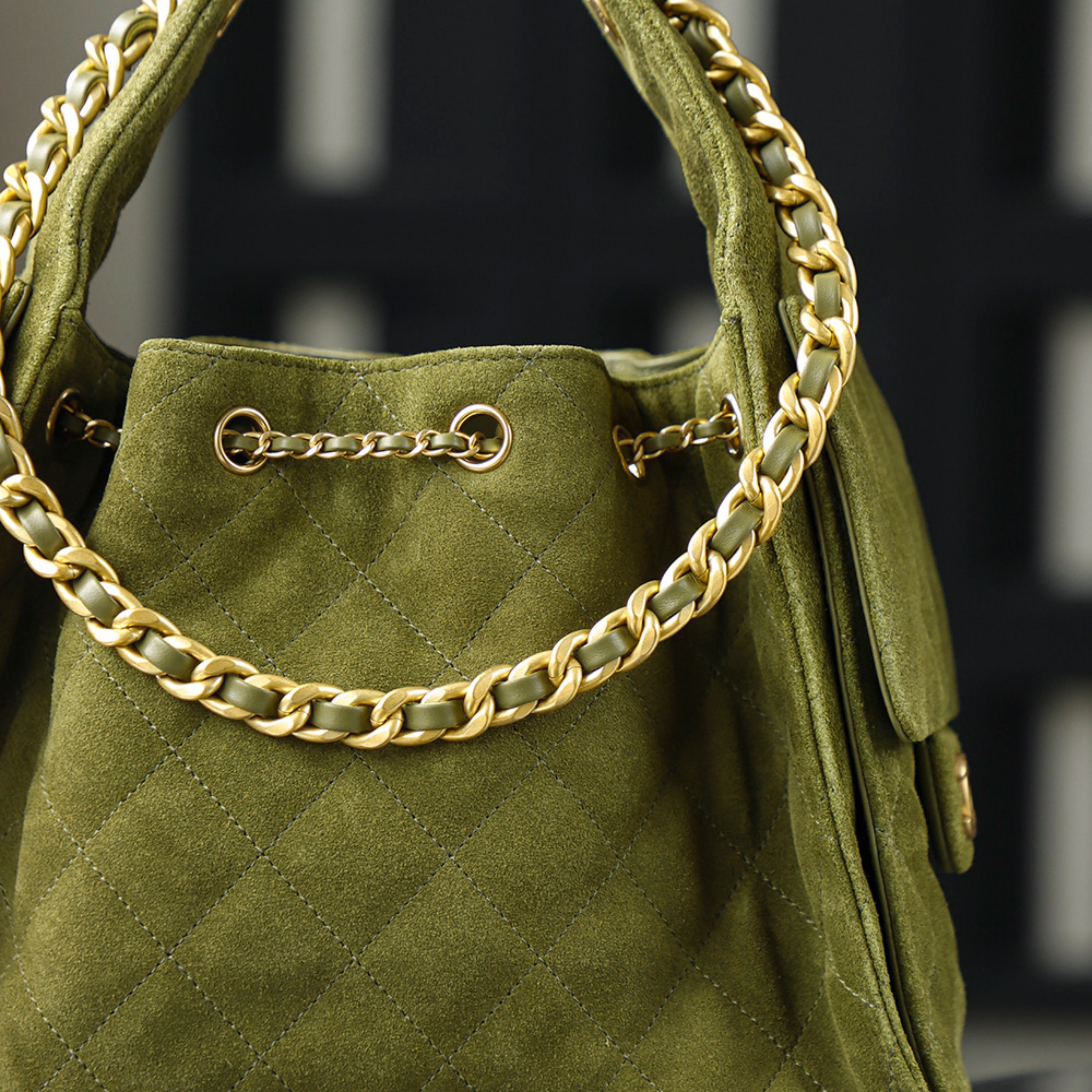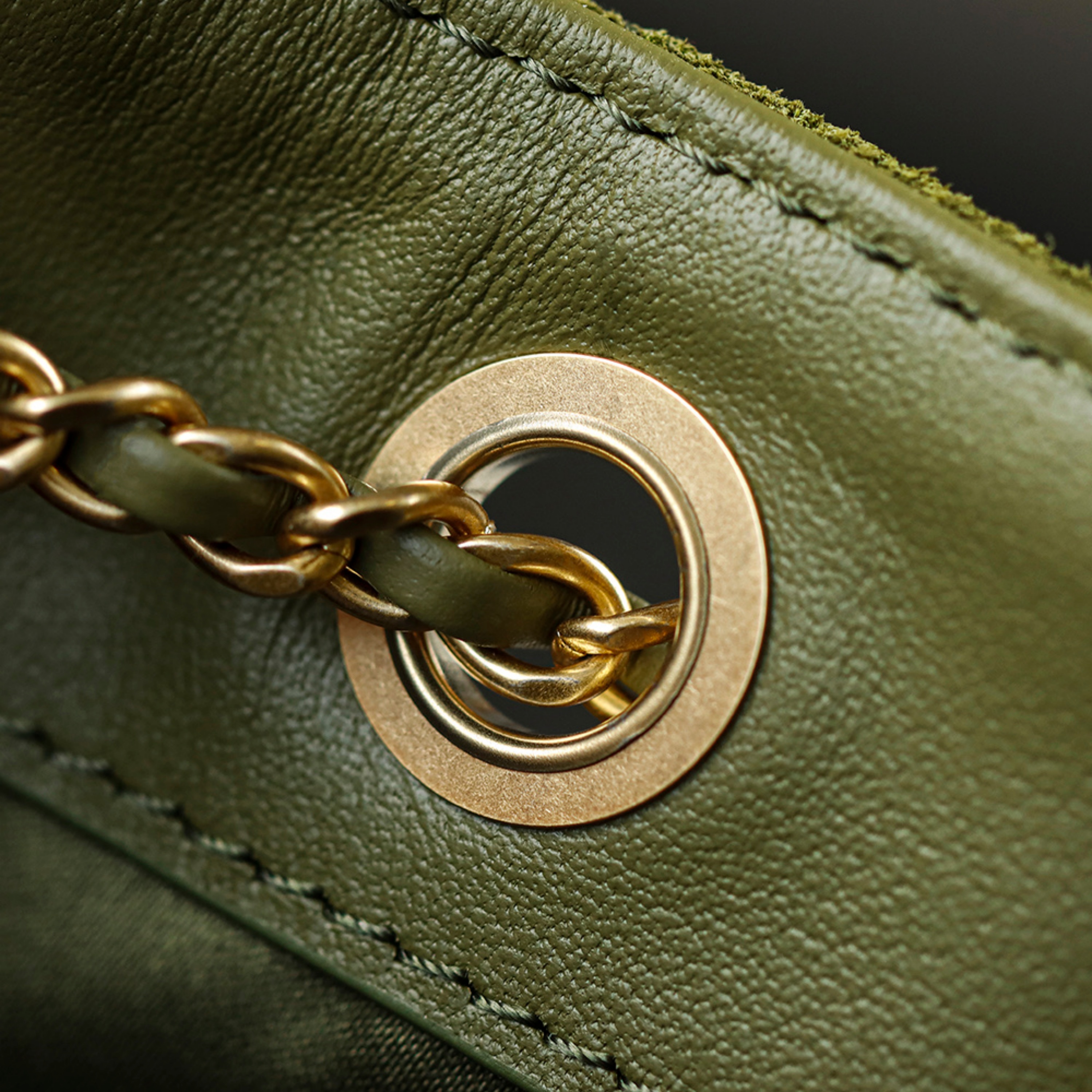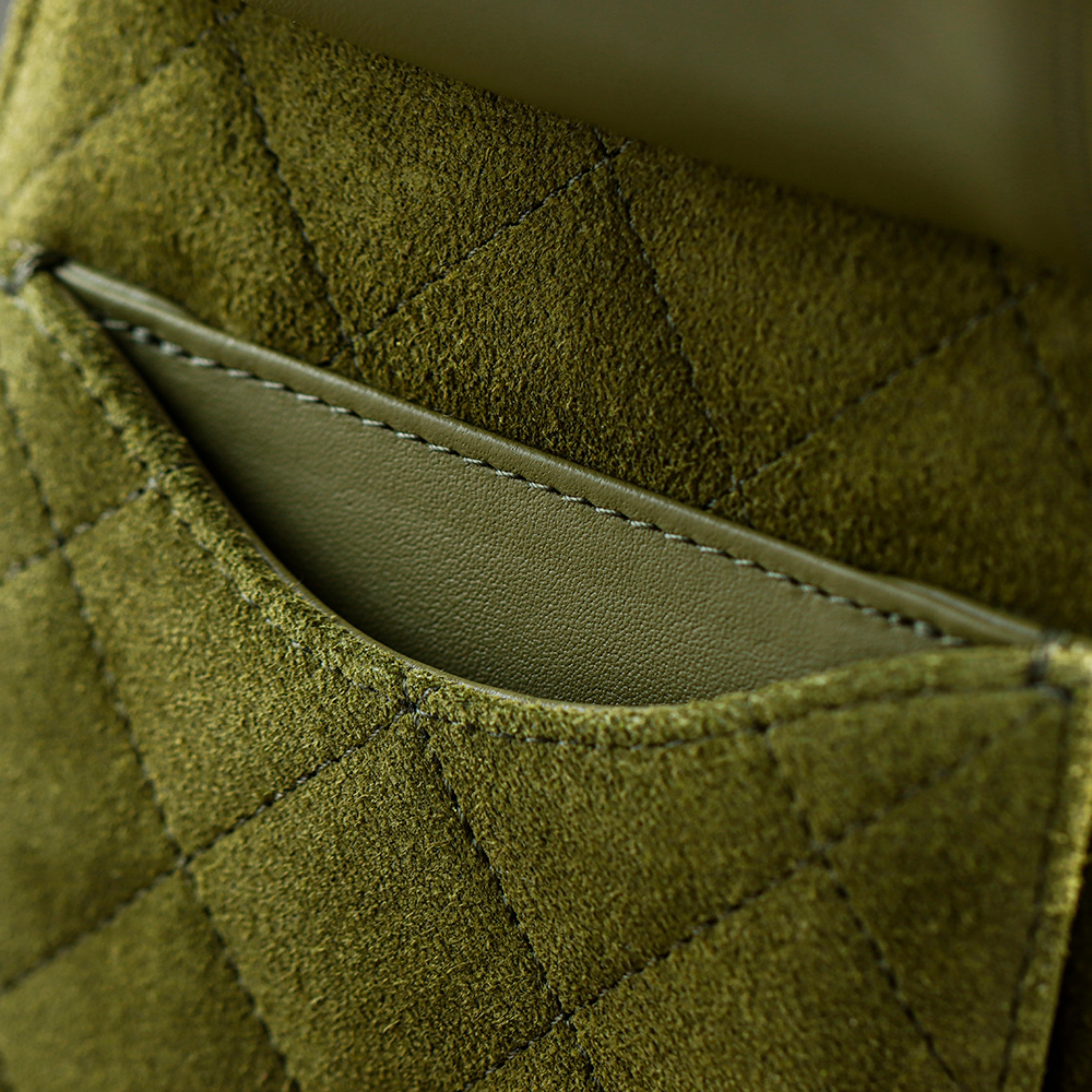 Crafted from selected premium suede, sourced from the same European tanneries that supply leading fashion houses, this rich forest green hue embodies depth and sophistication. The brushed surface offers a velvety texture that is both tactile and durable, while the supple lambskin edges ensure shape retention and a polished finish. This material combination reflects a harmony of softness and structure unique to CHANEL’s design philosophy.