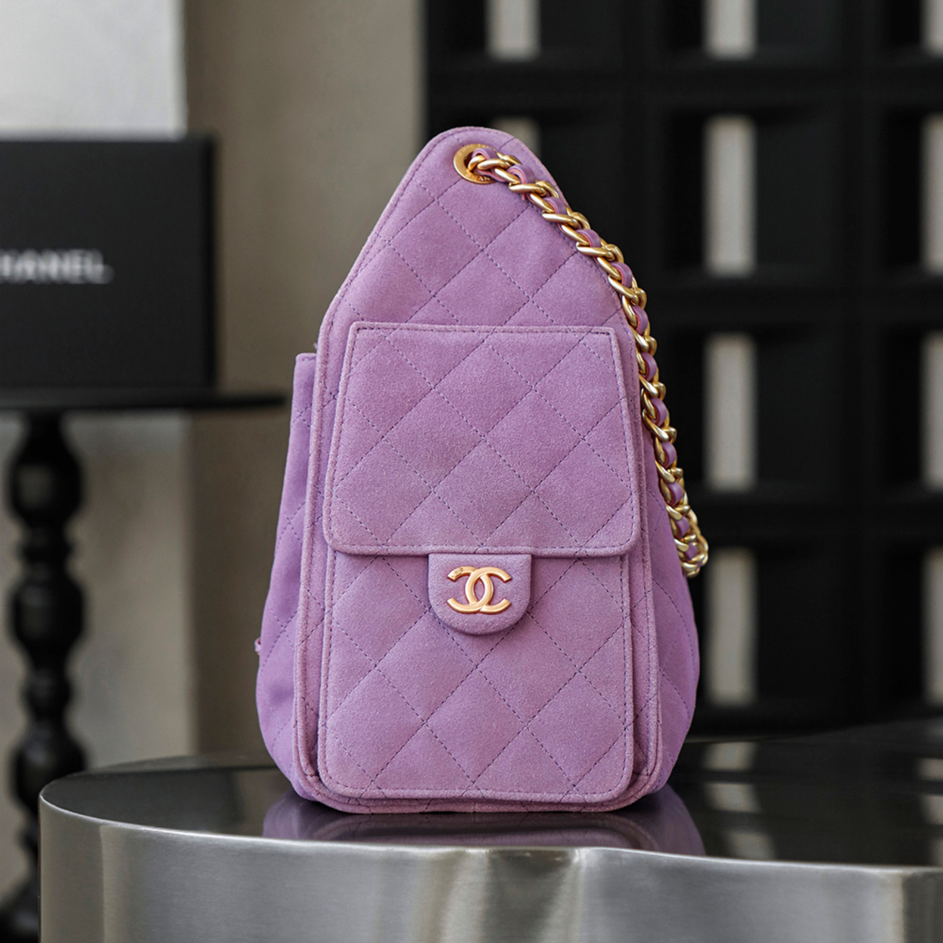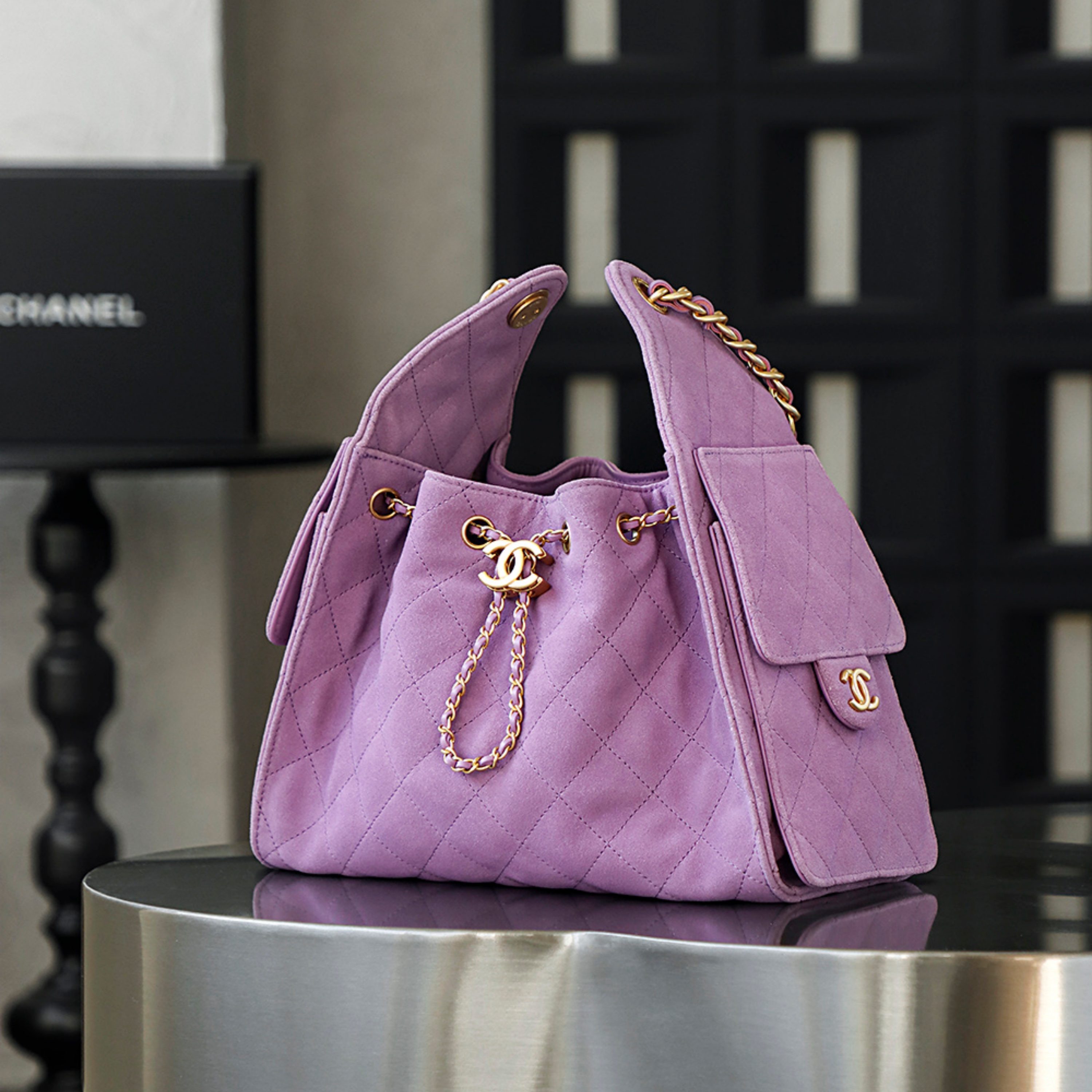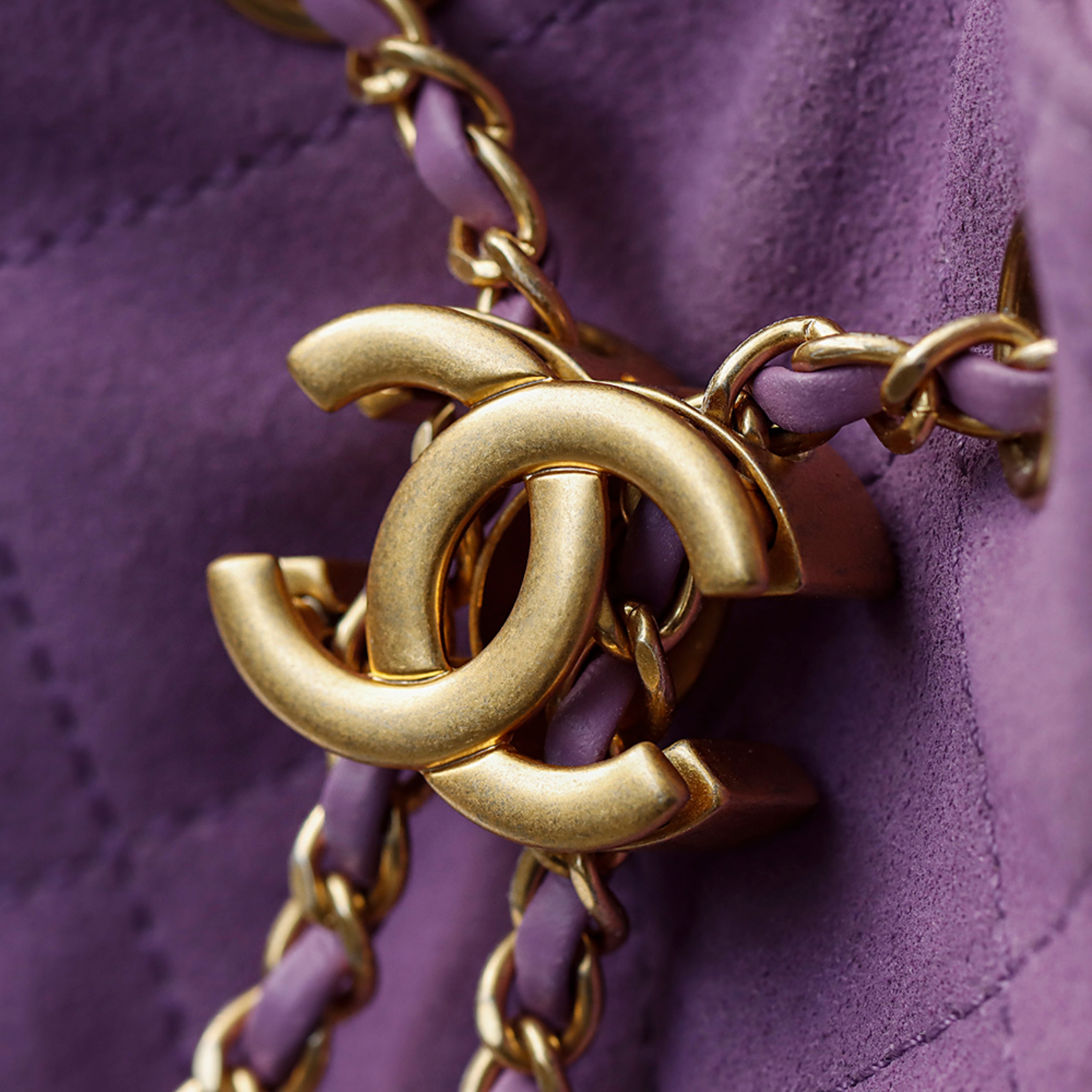 Discover the ultimate expression of luxury and craftsmanship with our globally premiered CHANEL 25 Bag in sumptuous purple suede. Meticulously crafted to meet the highest standards of excellence, this piece embodies the elegance and sophistication synonymous with the CHANEL legacy. Every detail, from the rich, velvety suede to the flawless hardware, reflects an unwavering commitment to superior artistry and timeless design.