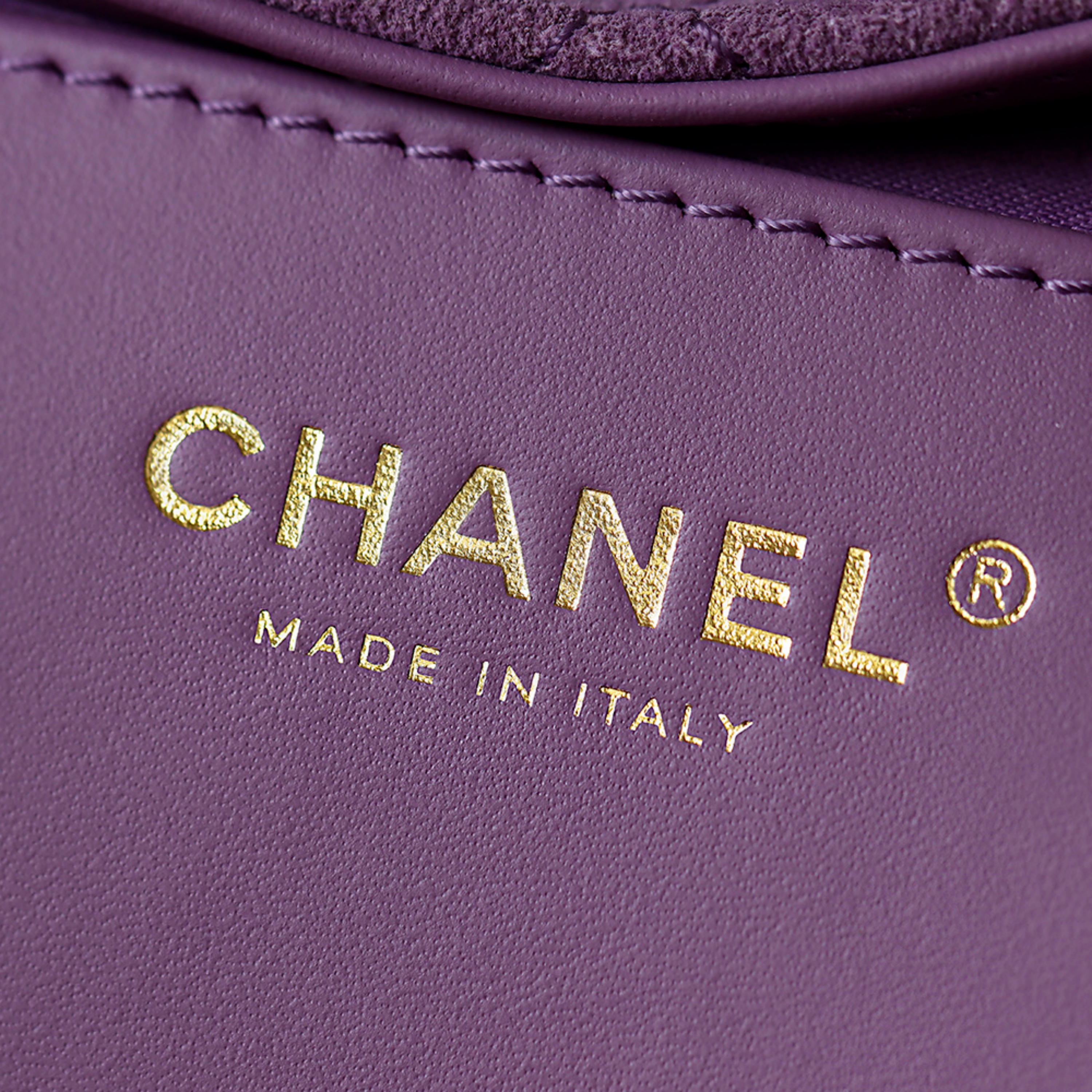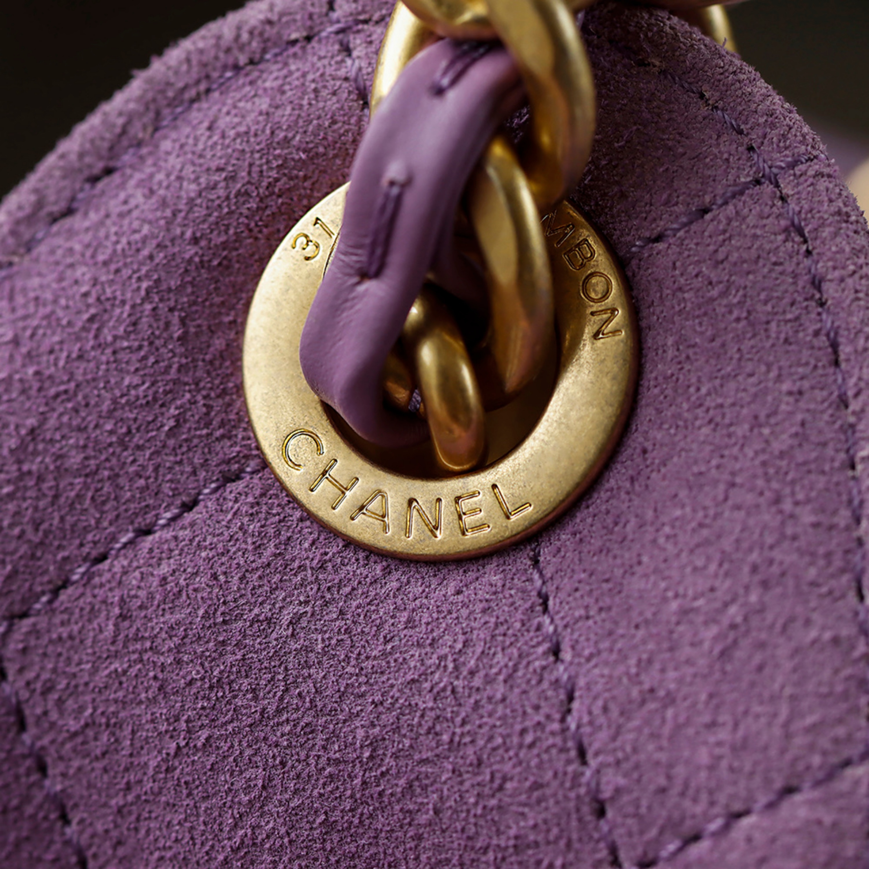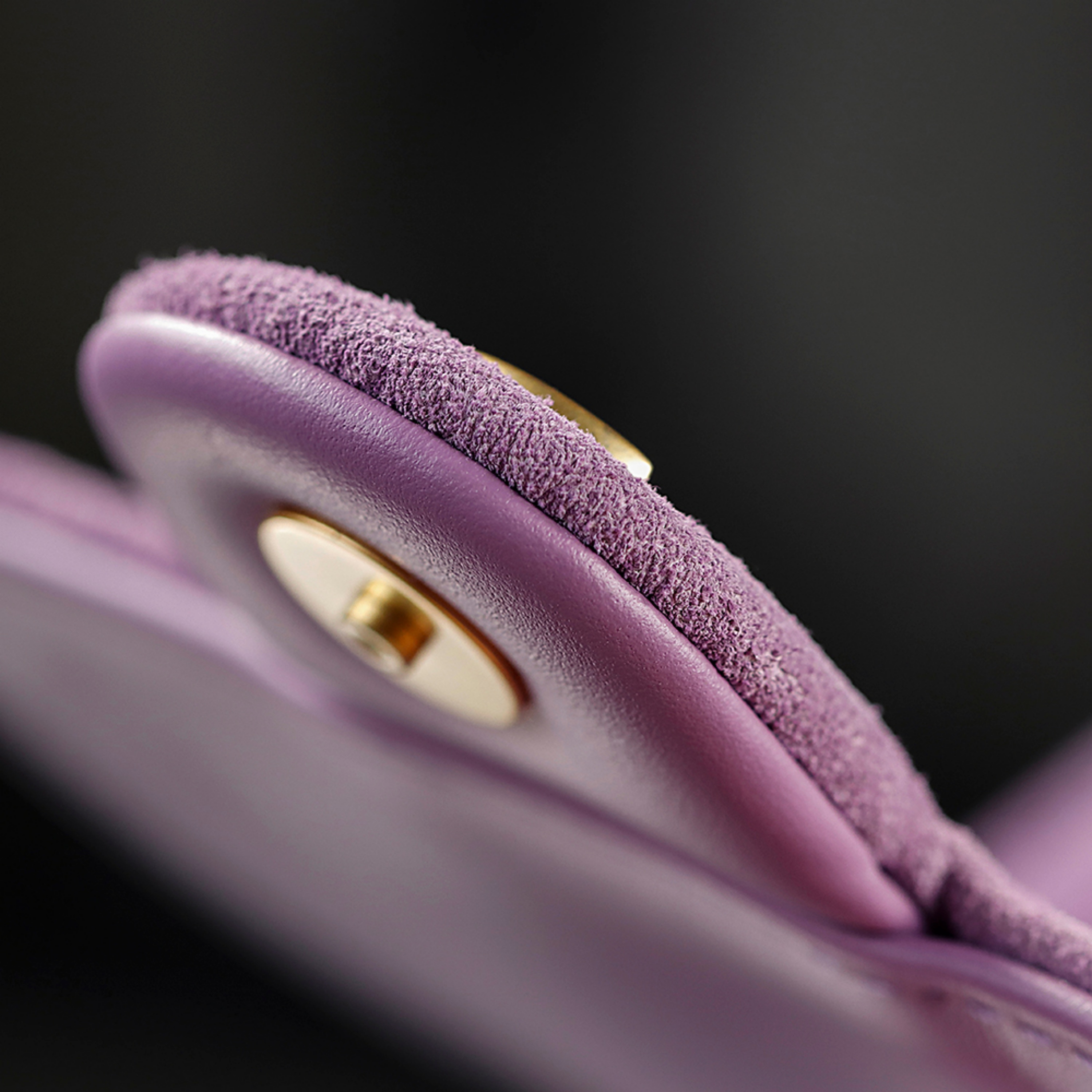 Materials: Premium Purple Suede, Cowhide Leather Trim, Textured Fabric Lining, Light Gold Electroplated Hardware