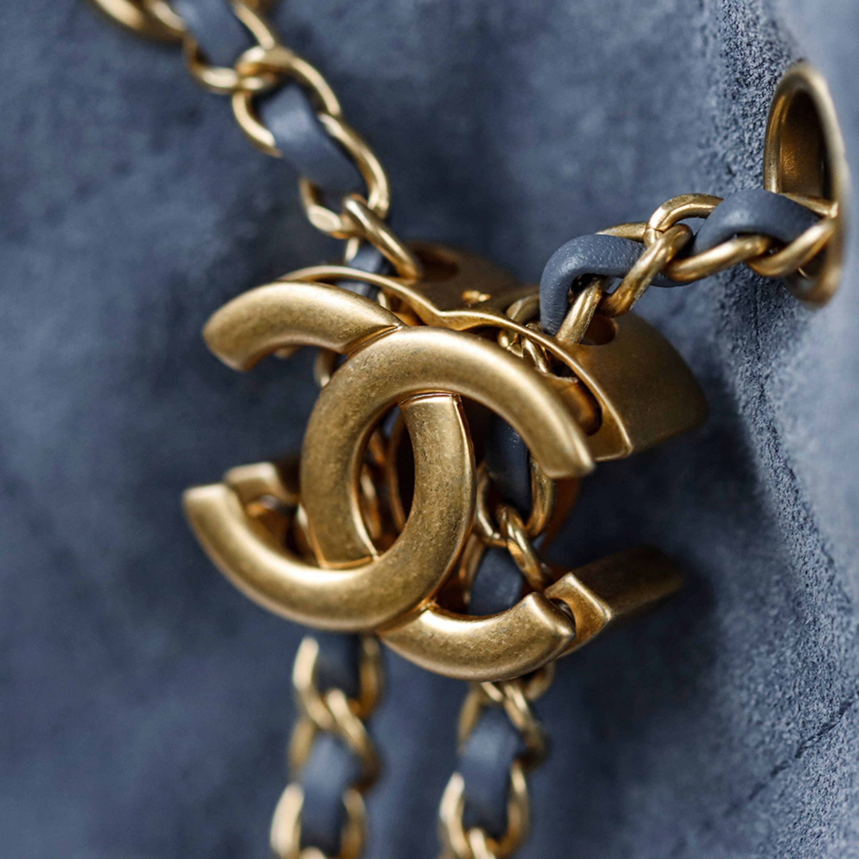 Denim Blue Suede, Calfskin Leather Trim, Woven Fabric Lining, Light Gold-Tone Metal Hardware