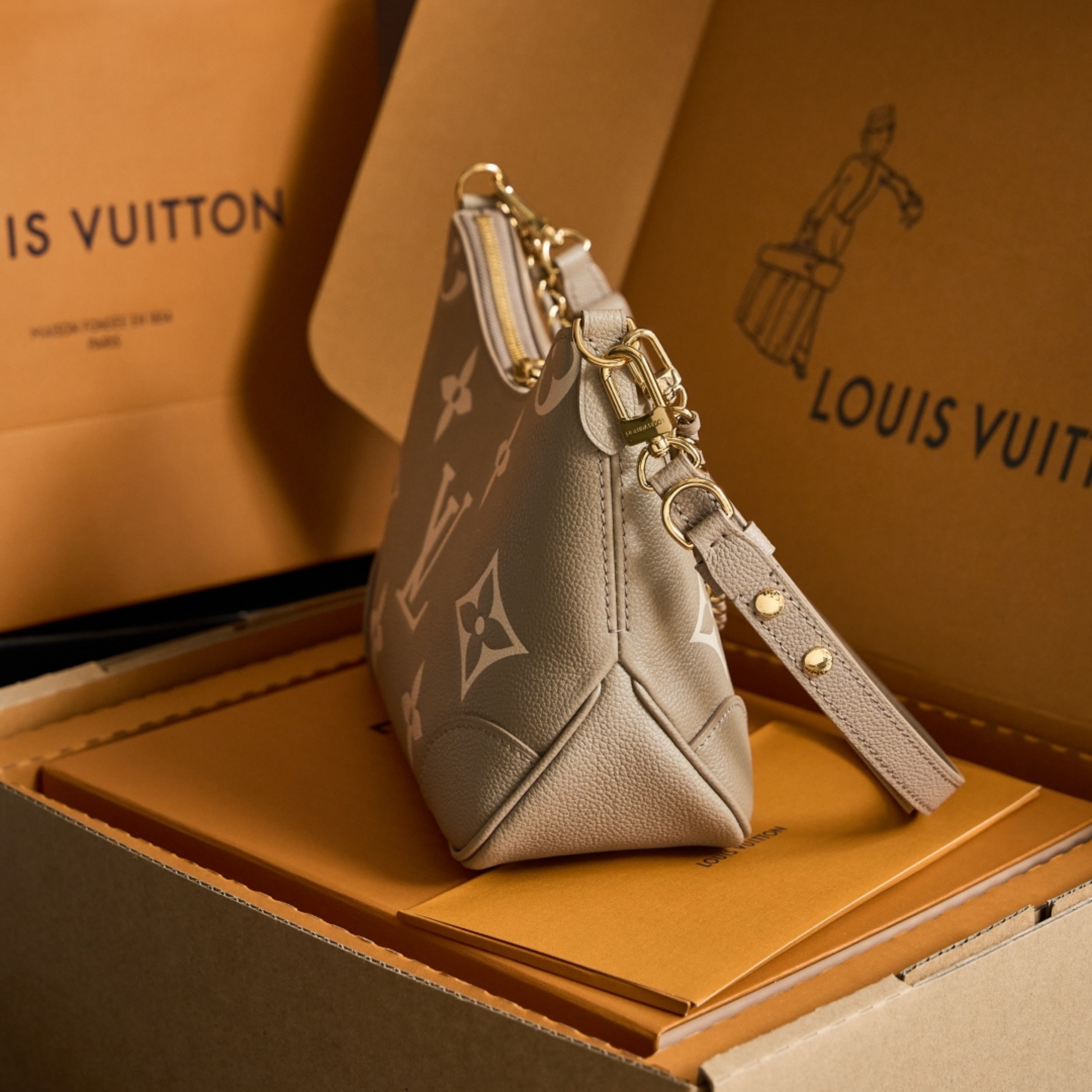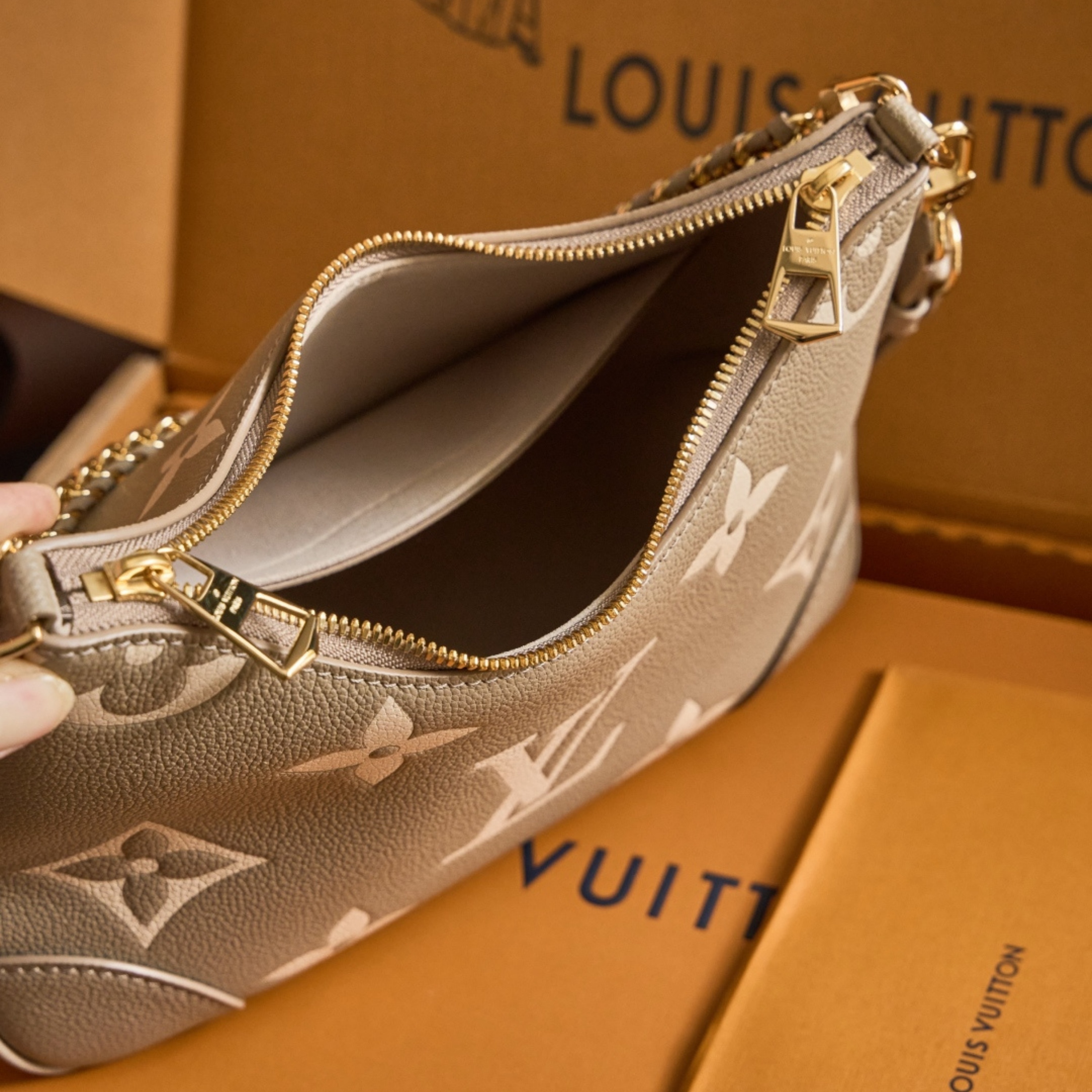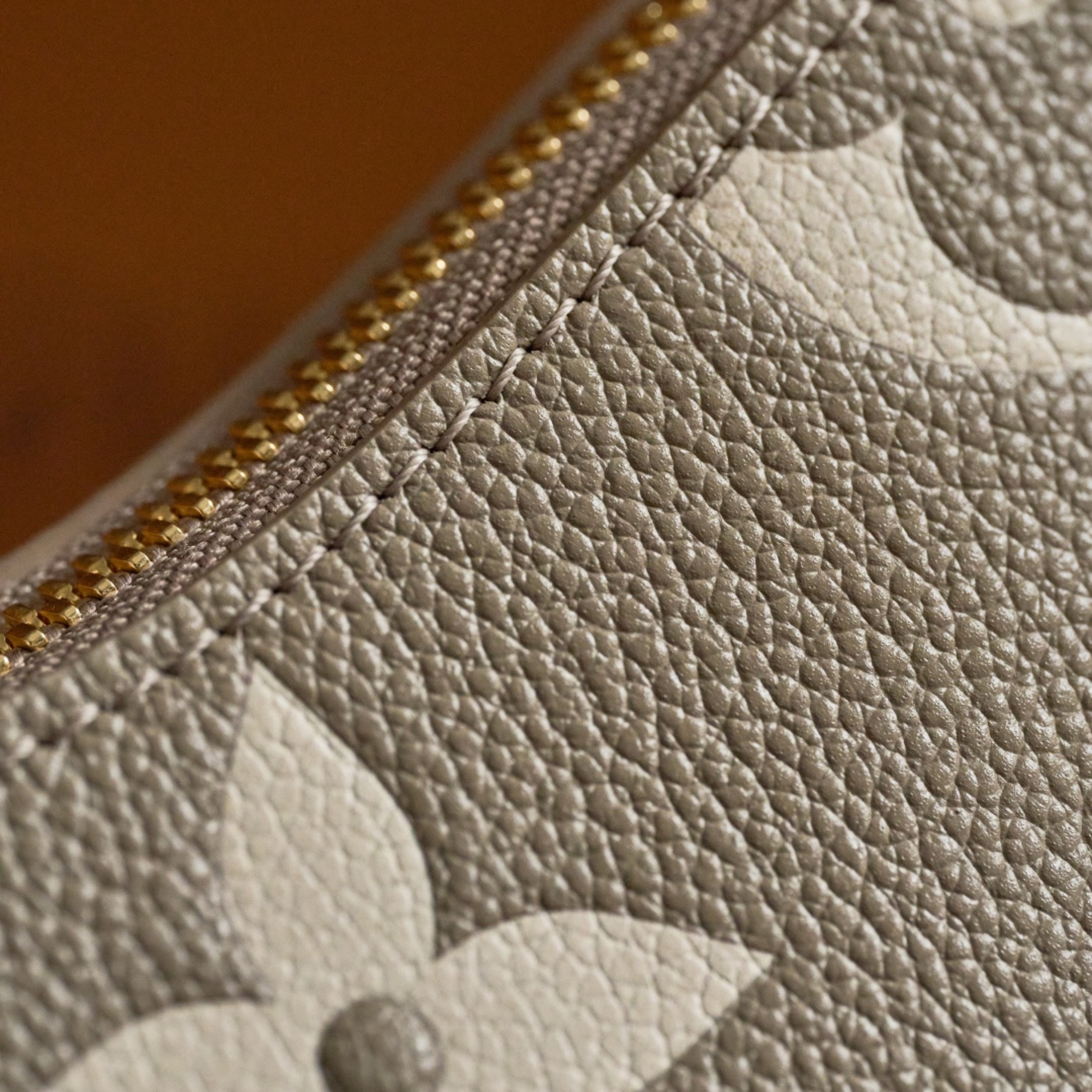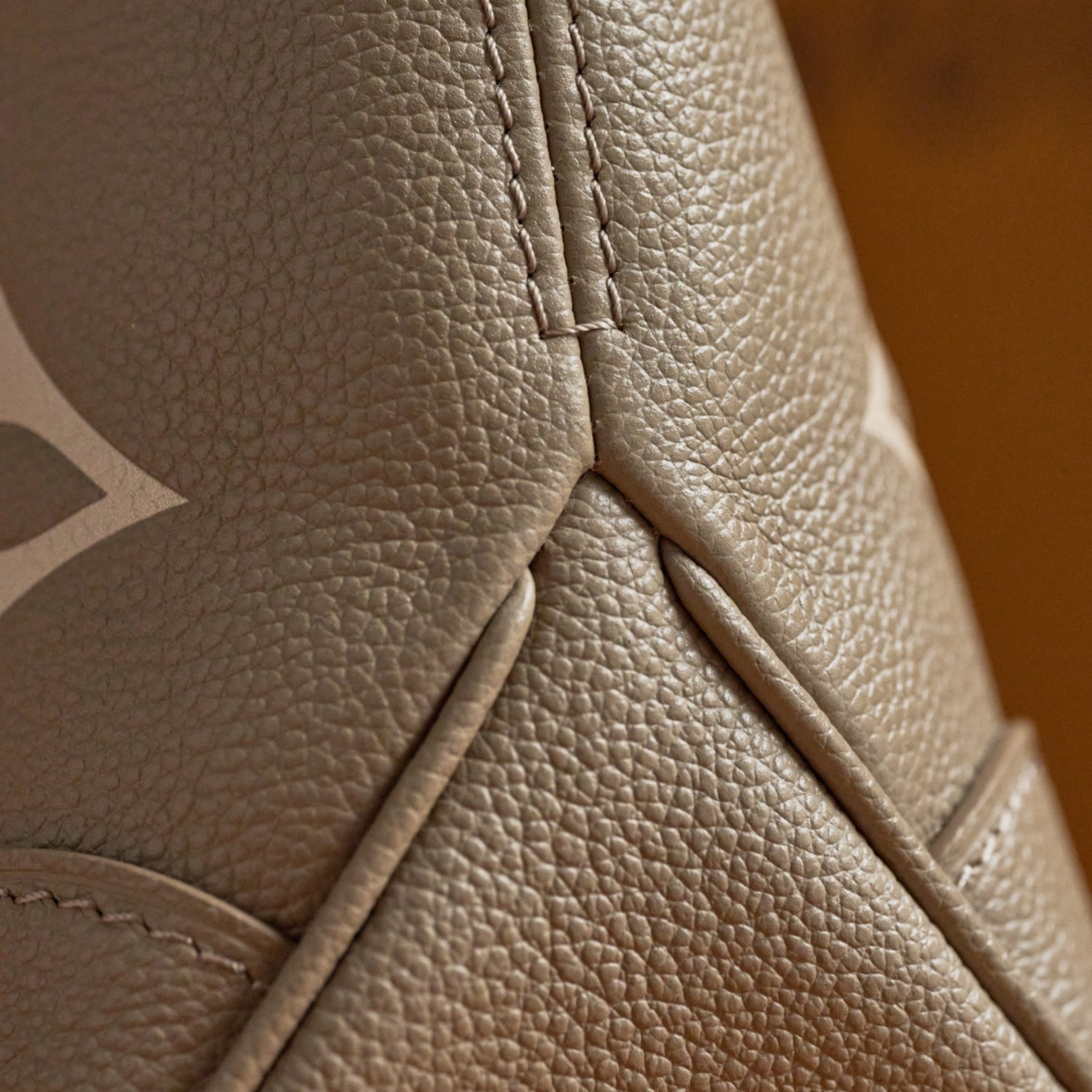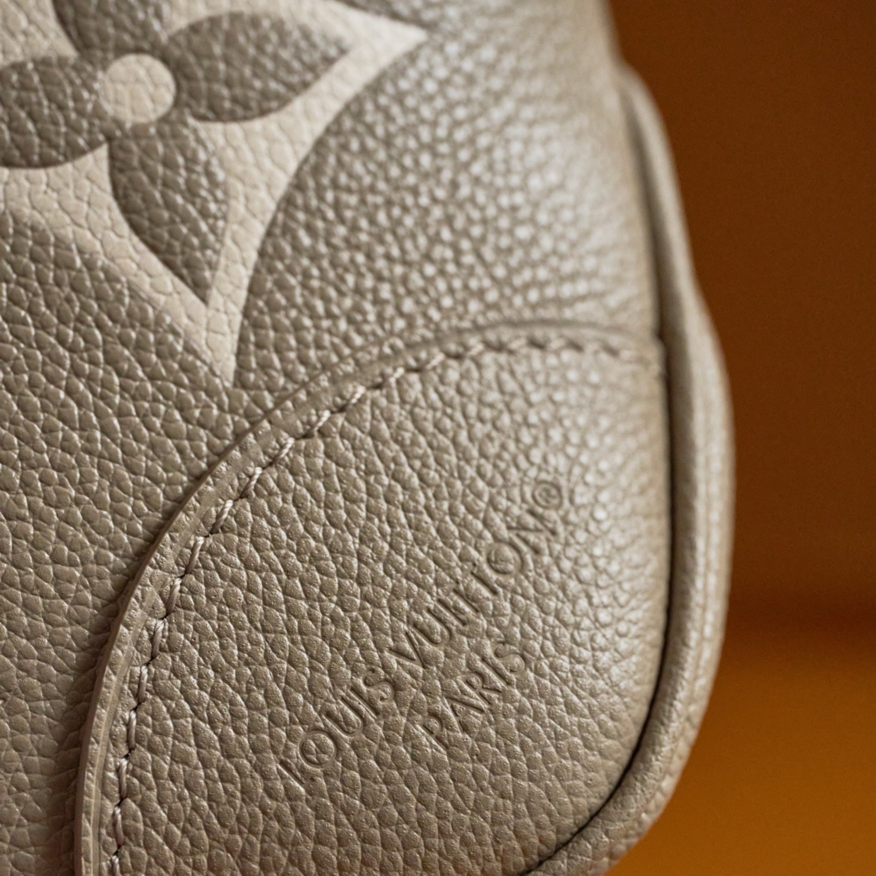 Crafted from Louis Vuitton’s proprietary Monogram Empreinte leather—a textured, embossed calfskin—the BOULOGNE exudes raw, organic luxury. The dual-layered hide showcases the brand’s signature LV motifs in a muted ivory and taupe palette, finished with a protective coating that resists wear while preserving its supple texture.