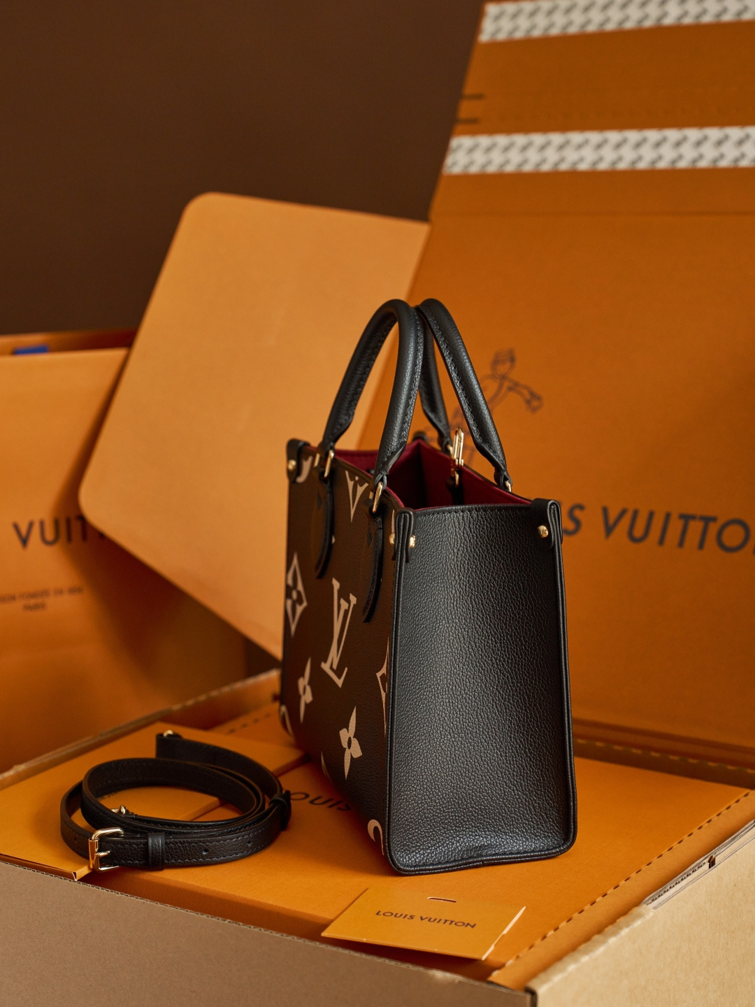 exclusively available through our platform. This piece reflects boutique-standard artistry, crafted with precision using French-atelier techniques that honor Louis Vuitton’s heritage. Inspired by the iconic 1968 Sac Plat, the Onthego PM reinterprets the classic tote with a contemporary compact silhouette, finished in sophisticated two-tone Monogram Empreinte leather. Each detail—from the dynamic chip coding to the exclusive light-gold electroplated hardware—ensures a flawless alignment with the original’s luxurious essence.