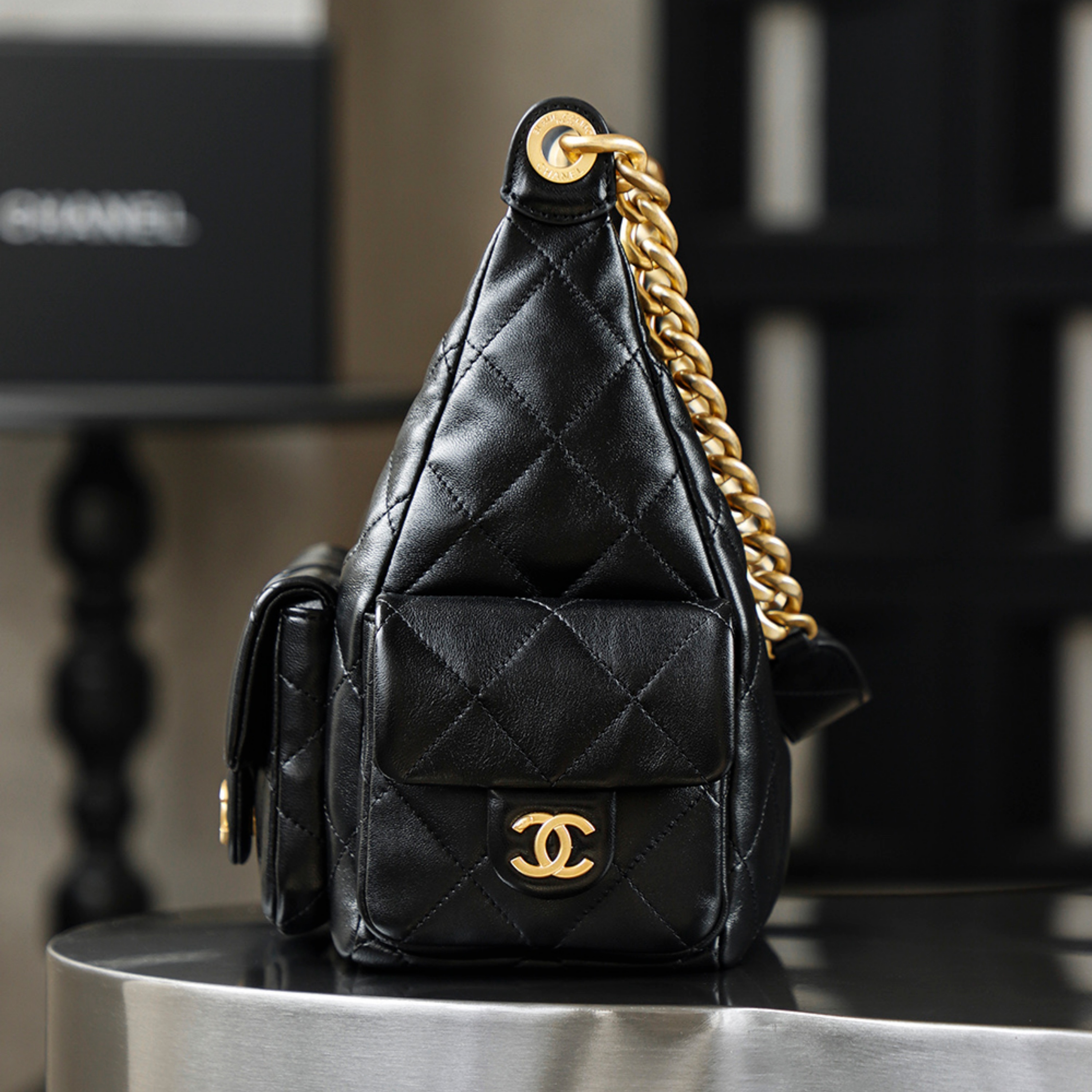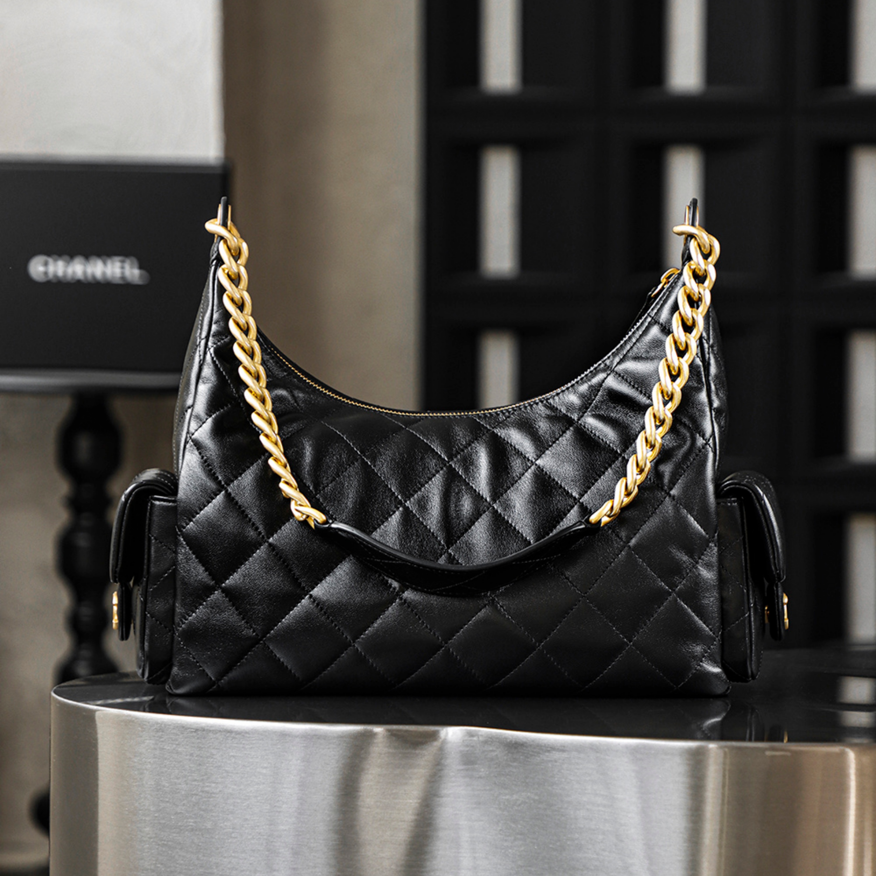 𝐂𝐇𝐀𝐍𝐄𝐋 25C Hobo Flap Bag in Black & Gold in Jumbo Size